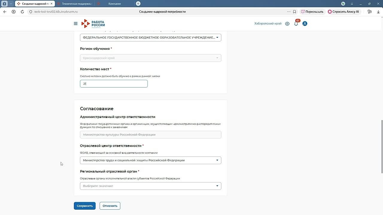 3. Подача заявки. Перейдите в раздел формирования кадровой потребности. Укажите: