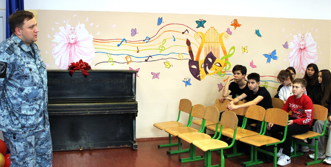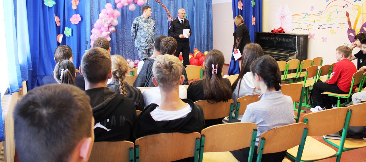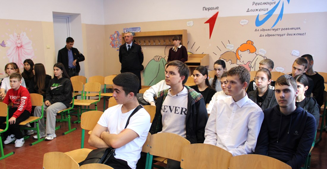 Очередная встреча прошла в Новоалексеевской школе №1 Генического муниципального округа для учеников 10 и 11 классов. Перед старшеклассниками выступил врио заместителя начальника полиции по охране общественного порядка капитан полиции Кирилл Павлов.