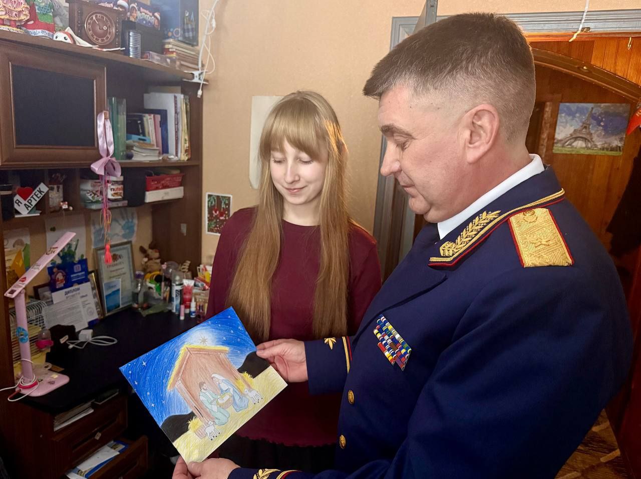 В рамках акции Дмитрий Викторович прибыл с тёплым визитом и подарками к талантливой и творческой жительнице поселка Новоалексеевка Херсонской области - 14-летней Есении, которая загадала желание-сюрприз. От всей души руководитель следственного управления подарил девочке мольберт с холстами, красками и кистями.