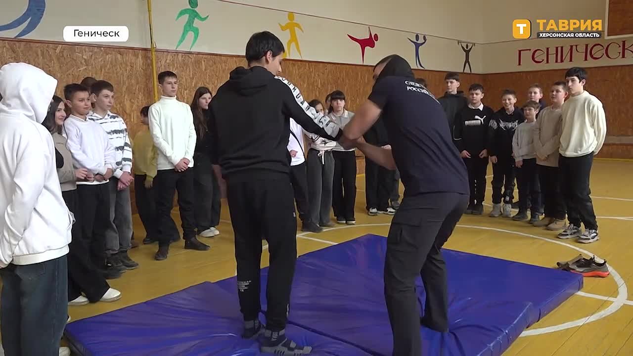 В спортивном зале ГБОУ ХО «Геническая школа № 4 Генического муниципального округа» состоялся урок по самообороне для учеников ведомственных кадетских классов, которые совсем недавно вступили в ряды молодых кадет. Физическое и патриотическое воспитание молодежи сегодня занимает особое место в общеобразовательном процессе, сотрудники СК России уделяют повышенное внимание подрастающему поколению, стараясь в полной мере передать свои знания и навыки для их достойного воспитания.