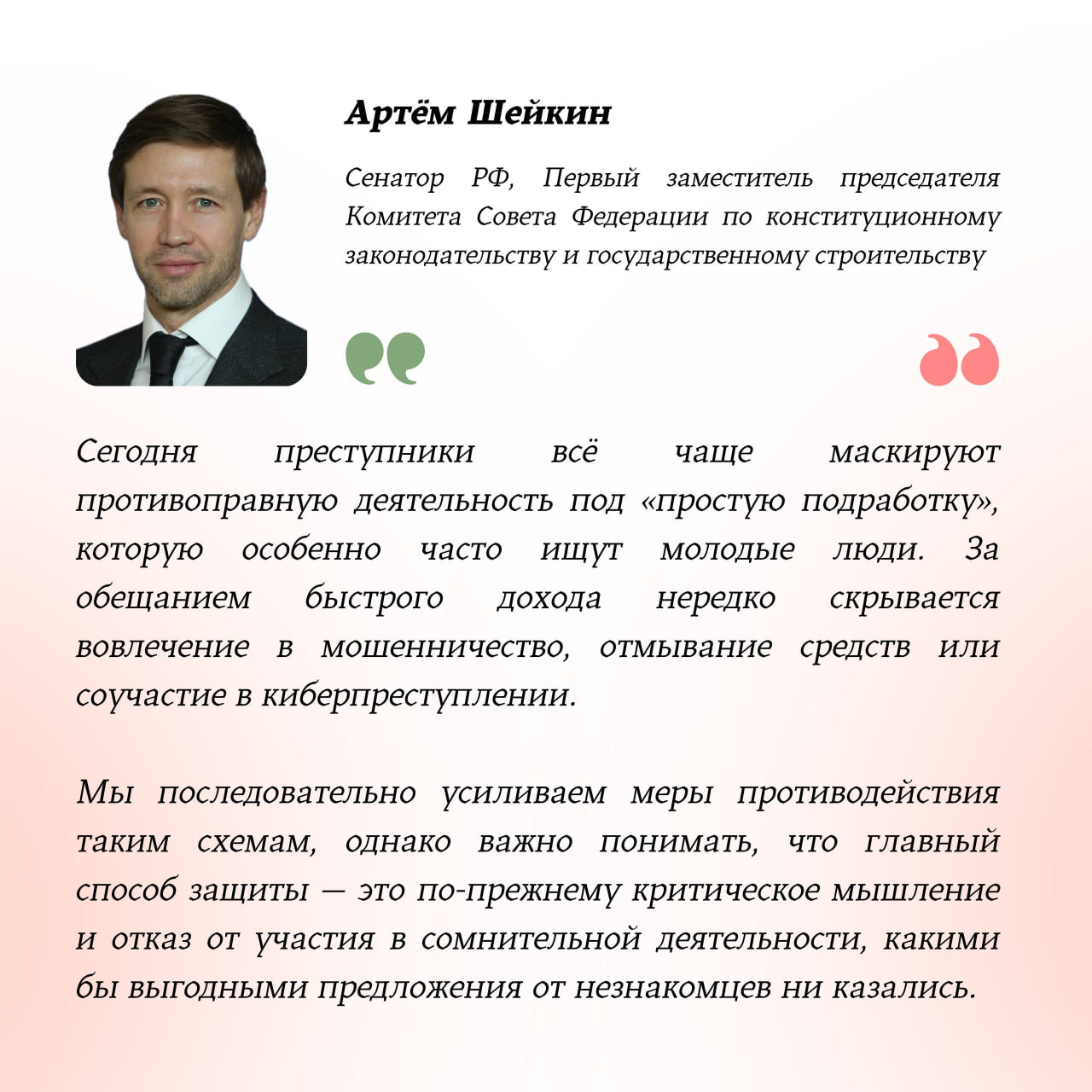 Совместно с Сенатором РФ Артемом Шейкиным подготовили инфографику о схемах «лёгкого заработка» в интернете и рисках, которые за ними скрываются.