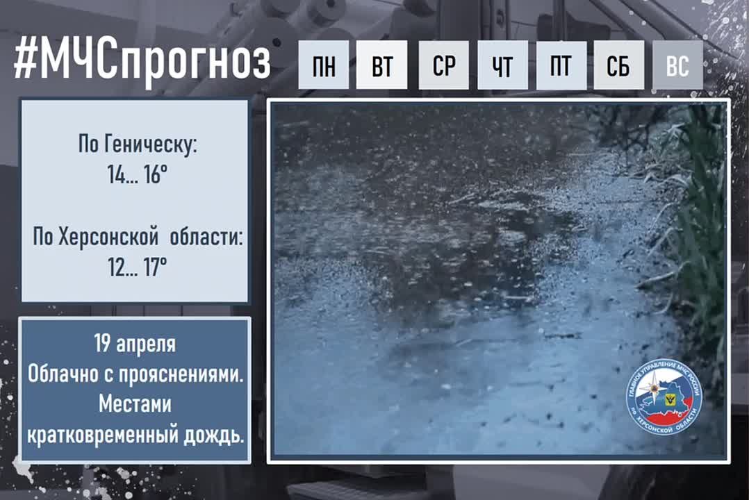облачно с прояснениями. Местами кратковременный дождь, днём в отдельных районах сильный дождь, гроза, град. Ветер северо-западный и северный 8-13 м/с, при грозе до 16 м/с. Температура воздуха ночью 6...11°, днём 12...17°.