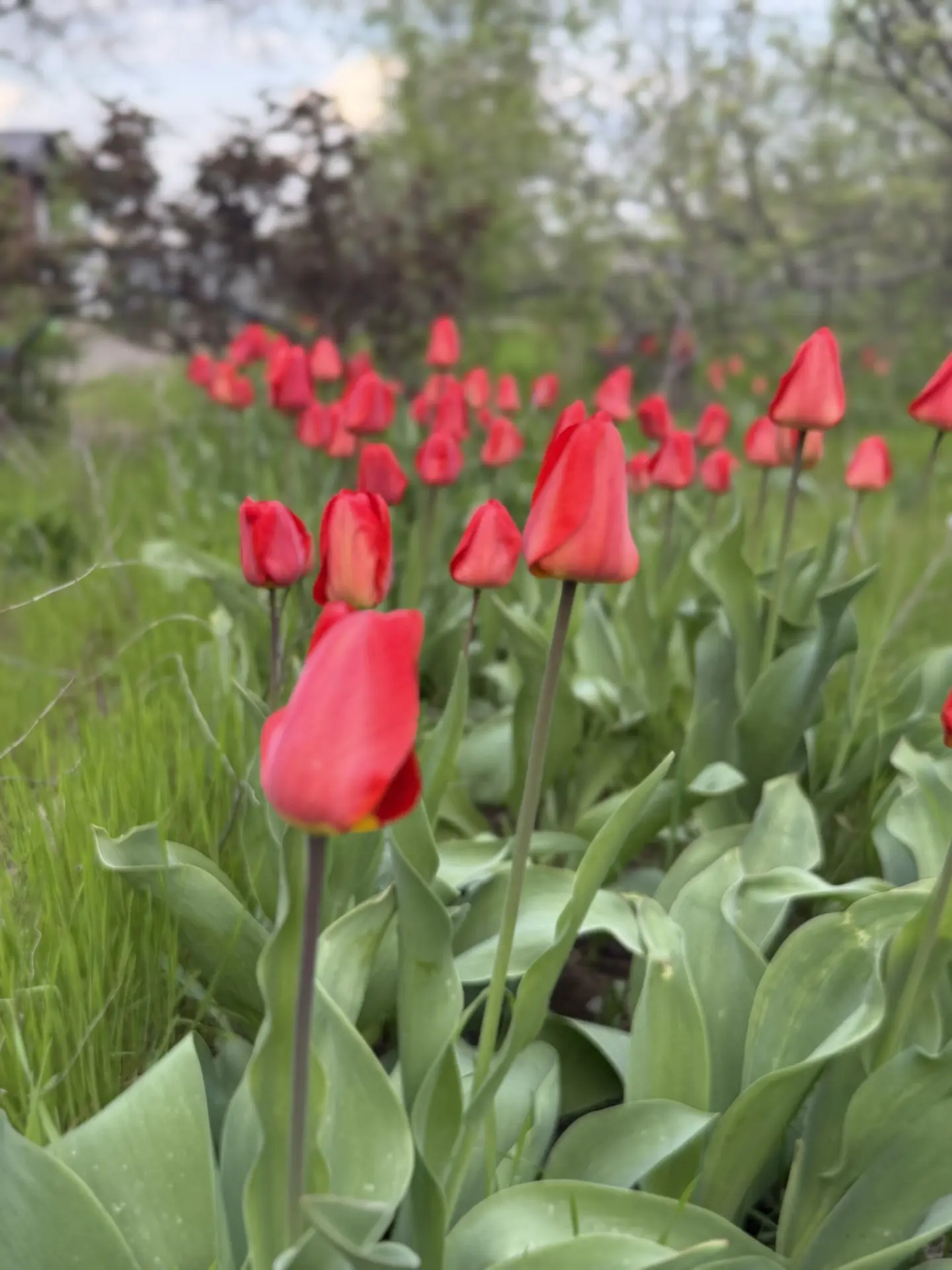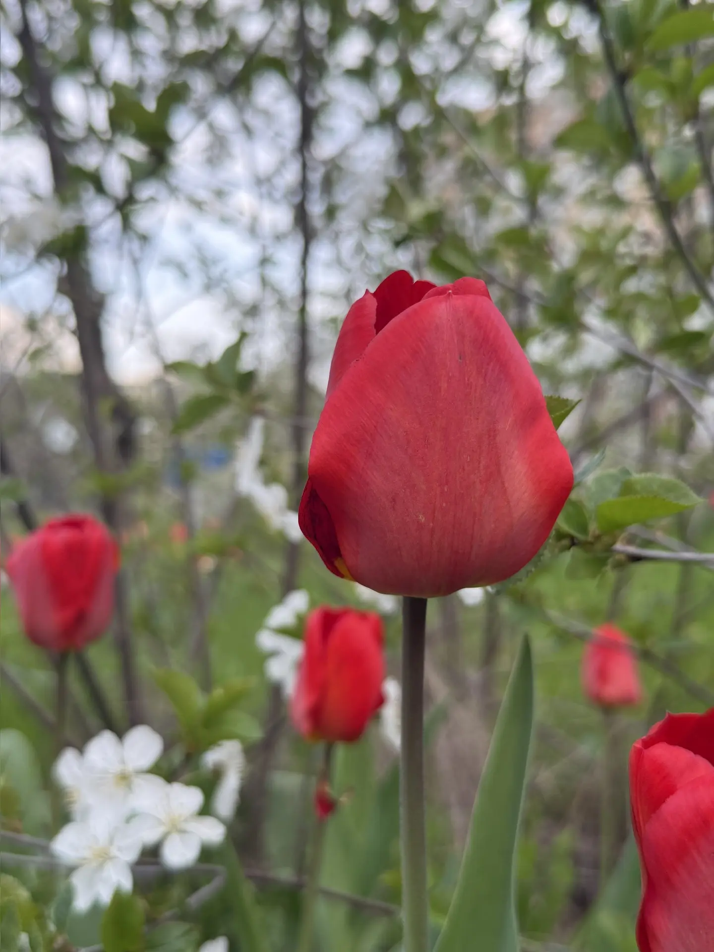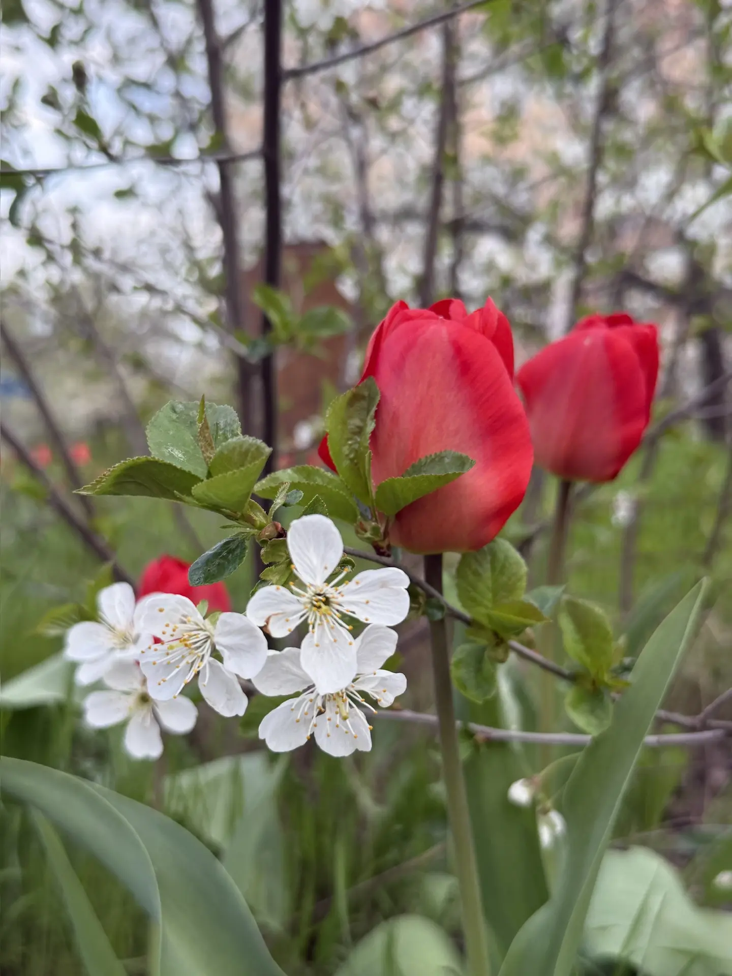 Раньше цвели абрикосы, как сумасошлатые, но уже отцвели, а вишни и тюльпаны очень сильно повылазили.