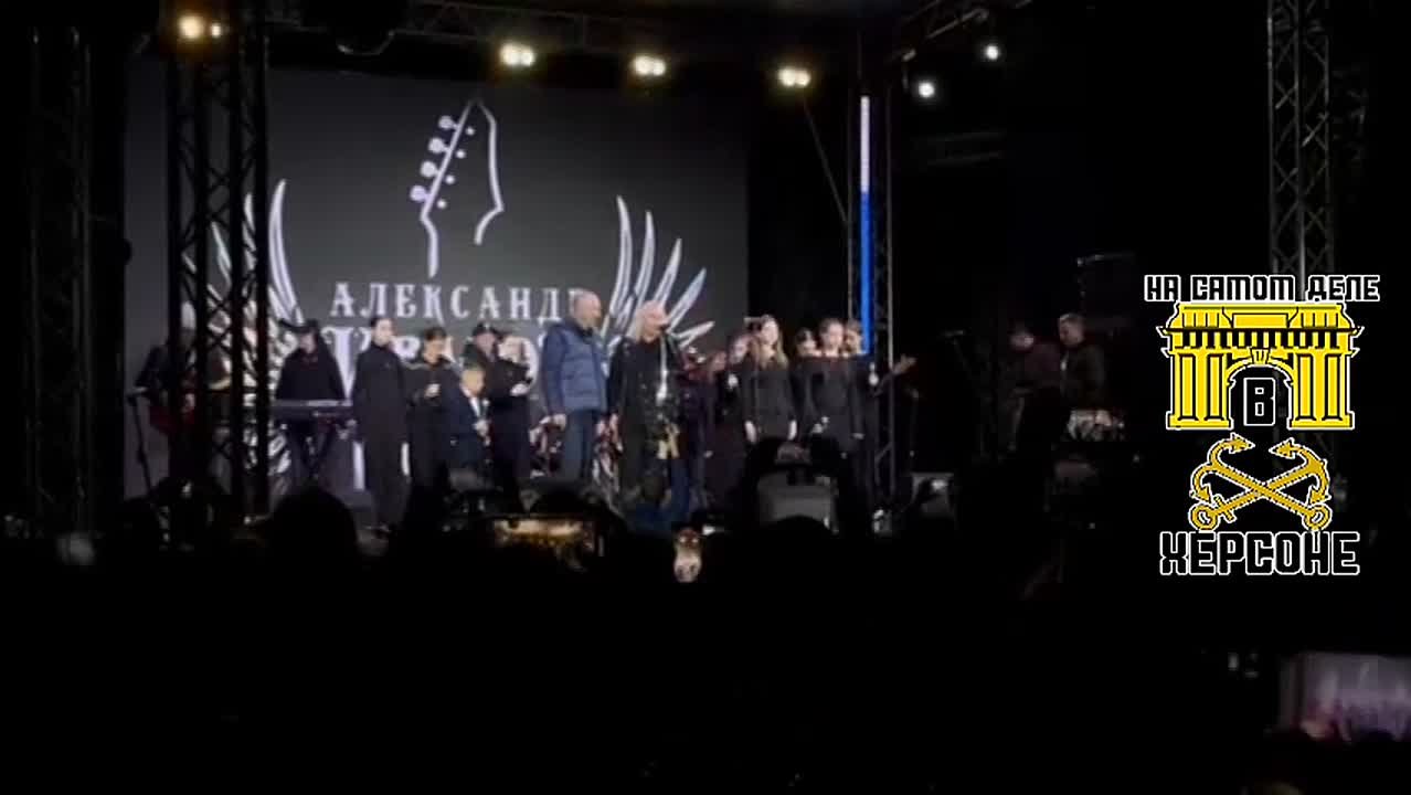 Губернатор Херсонской области Владимир Сальдо вместе с группой "Рондо" и детским хором исполнили песню "О Родине" на концерте в Геническе в честь дня воссоединения Новороссии и Донбасса с Россией.