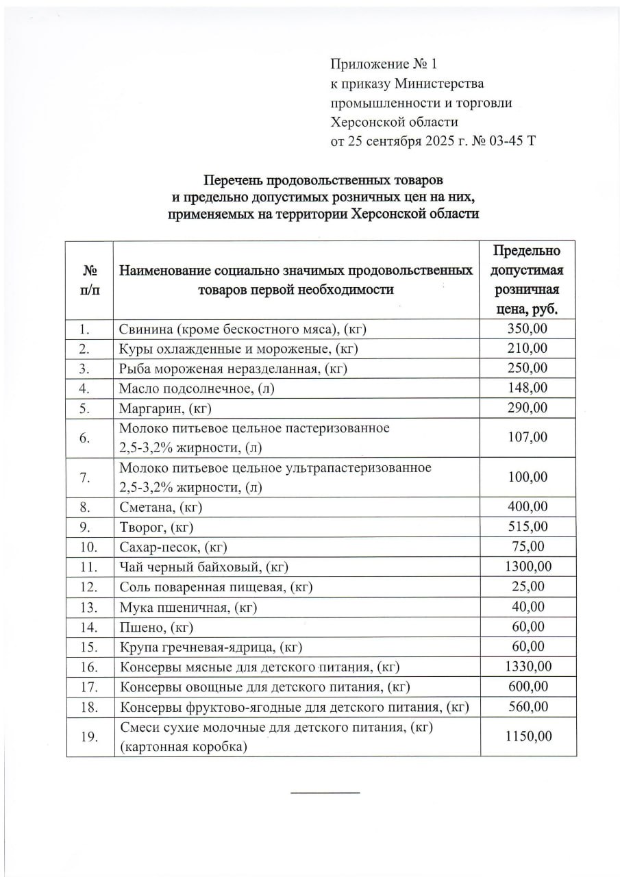 Согласно приказу Министерства промышленности и торговли Херсонской области от 25.09.2025 № 03-45Т, с 6 октября 2025 года на территории региона вводятся предельно допустимые розничные цены на отдельные виды товаров.