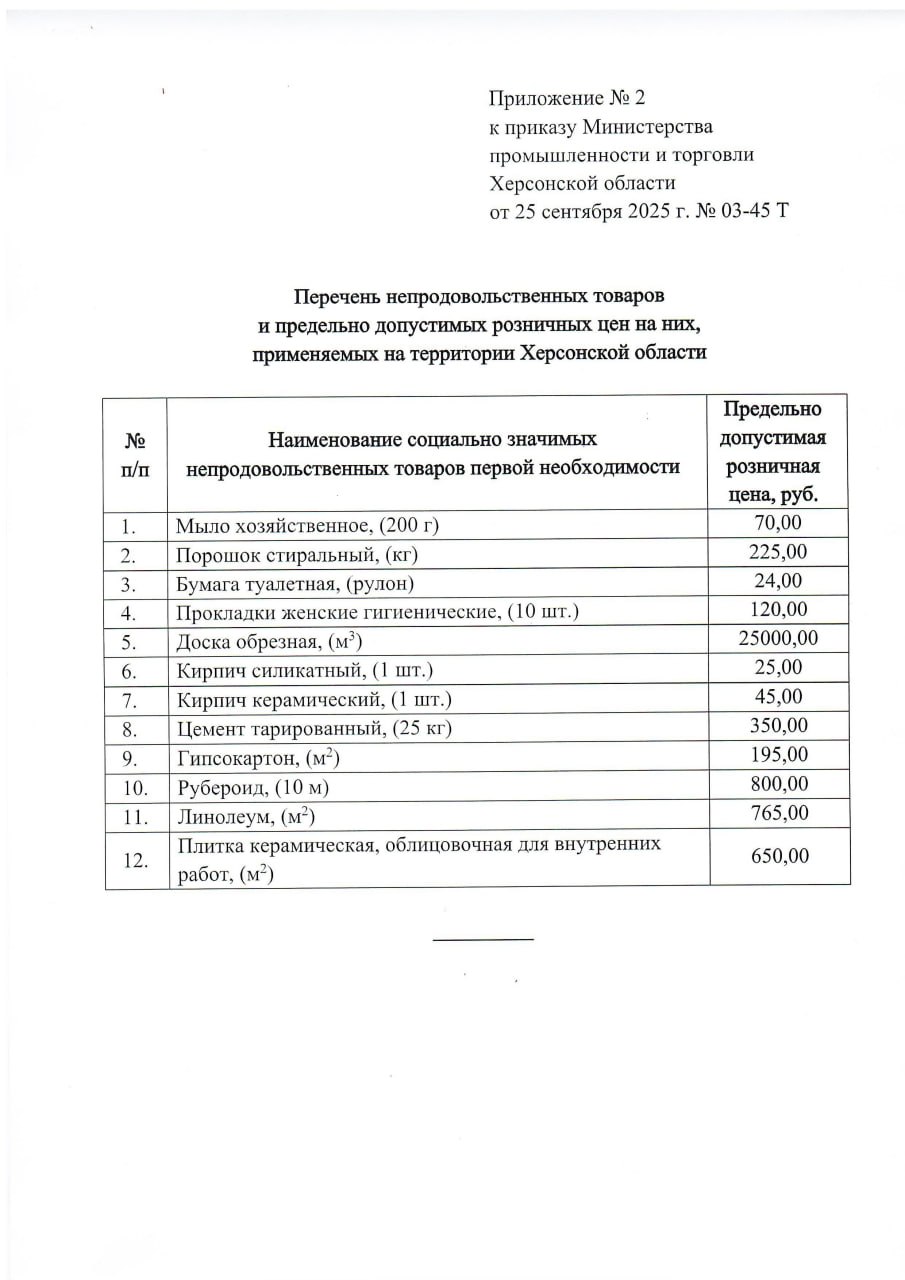 С приказом Министерства промышленности и торговли Херсонской области от 25.09.2025 № 03-45Т можно ознакомиться на официальной сайте администрации Генического МО: https://genichesk.gosuslugi.ru/netcat_files/188/1768/Prikaz_ob_utverzhdenii_tsen.pdf