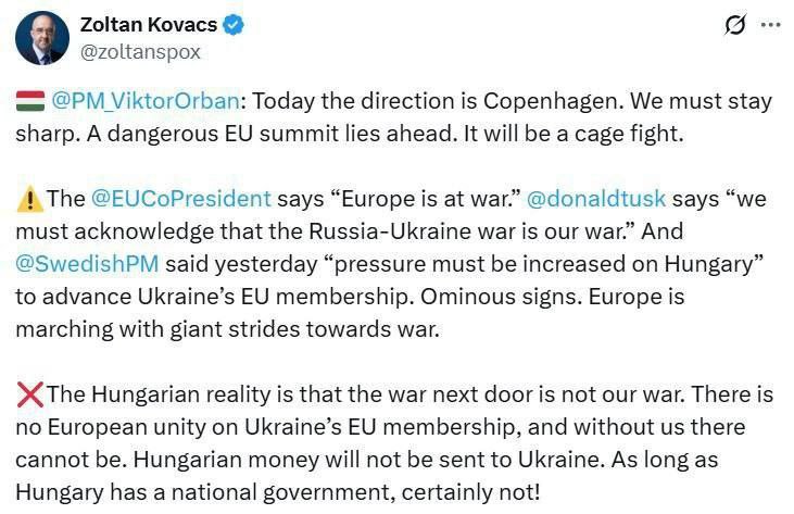 Премьер-министр Венгрии Виктор Орбан выступил с жёсткой позицией в отношении финансовой помощи Украине. Его заявление распространил в запрещённой в России соцсети Х правительственный спикер Золтан Ковач.