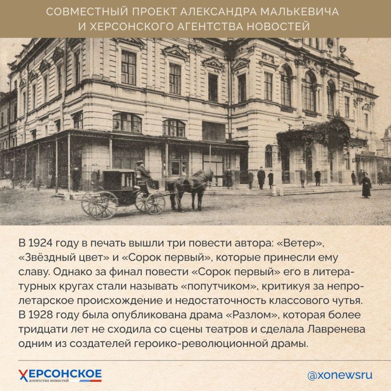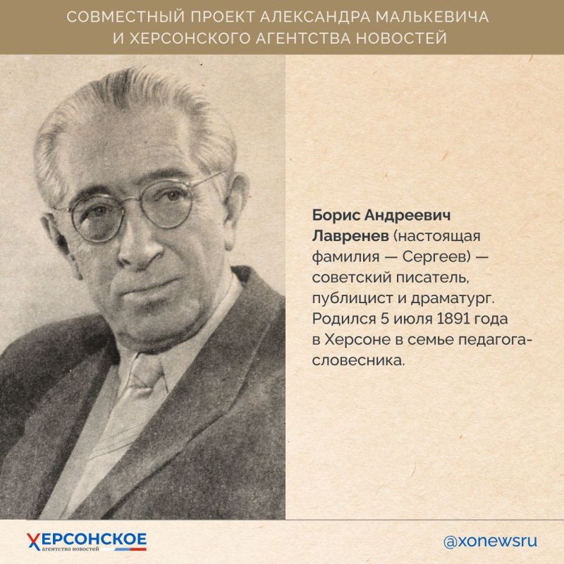 Одна из ярких и мятежных судеб — история писателя-мариниста Бориса Лавренева из Херсона. Его жизнь была полна невероятных поворотов: побег из дома в море, служба в артиллерии, арест. Свои приключения он превращал в блистательную прозу, а его пьеса «Разлом» 30 лет не сходила с театральных сцен.