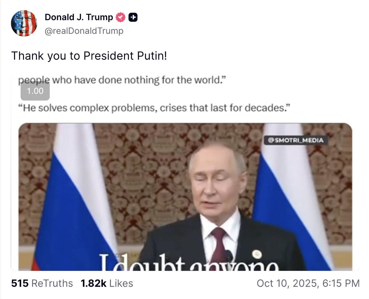 Трамп благодарит Путина за слова о Нобелевской премии.