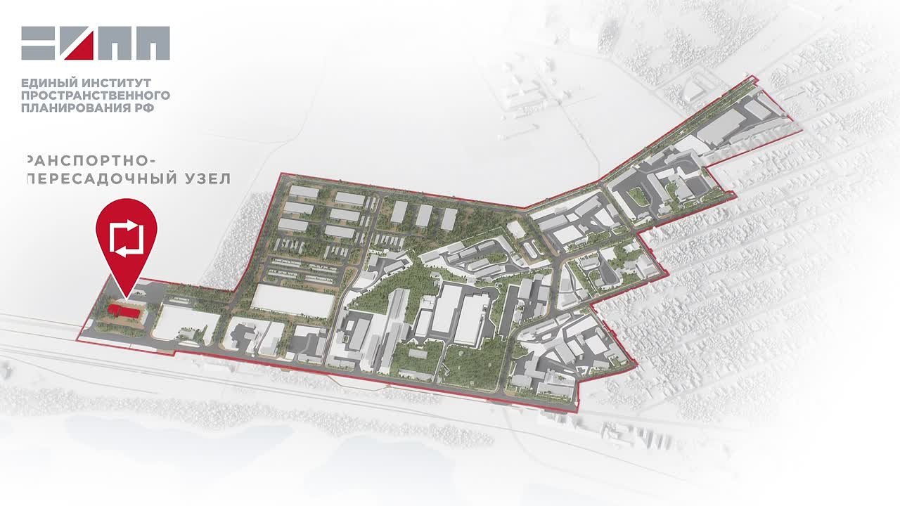 В западной части предлагается сформировать транспортно-пересадочный узел, в состав которого войдут автостанция общей площадью 1,3 тыс. кв. м, железнодорожная станция, остановки общественного транспорта, отстойно-разворотная площадка общественного транспорта и перехватывающая парковка.