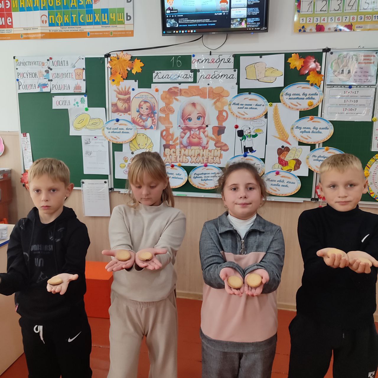 В третьем и четвёртом классах прошёл совместный праздник осени, посвящённый Всемирному дню хлеба. Дети с удовольствием читали стихи и пели песни, связанные с осенью и хлебом. Также отгадывали загадки, рассказывали пословицы, смотрели и обсуждали видеофильм об истории появления хлеба, процессе его выращивания, уборки и выпечки. В рамках праздника выполнялись интерактивные задания.