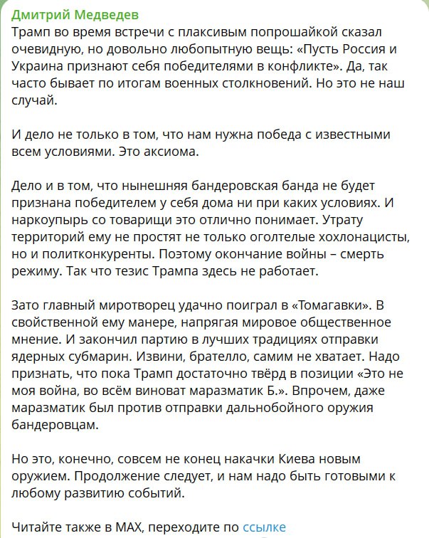 Он подчеркнул, что киевский режим не будет признан победителем ни при каких условиях. Также Медведев упомянул, что даже администрация Байдена была против передачи Украине дальнобойного оружия, и призвал быть готовыми к любому развитию событий.