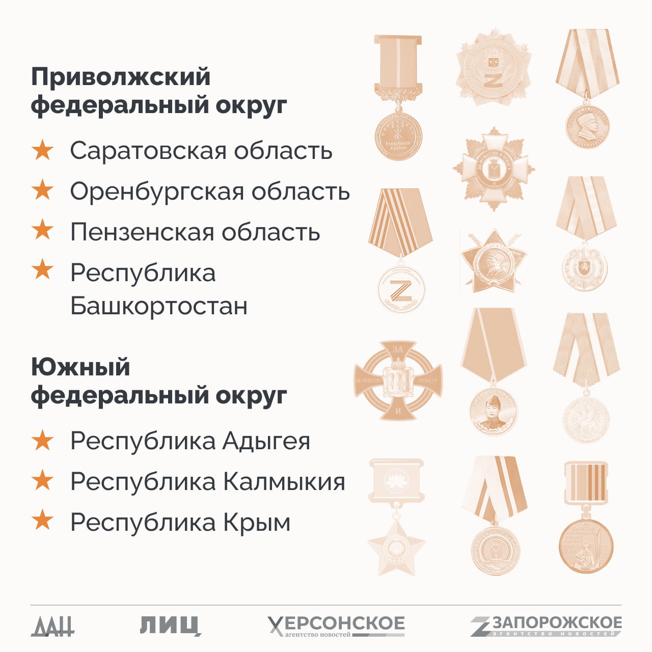 Спецпроект «СВО: Региональные награды» создан информационными агентствами Донбасса и Новороссии – ХАН, ДАН, ЛИЦ и ЗАН – совместно с журналистом Александром Малькевичем.