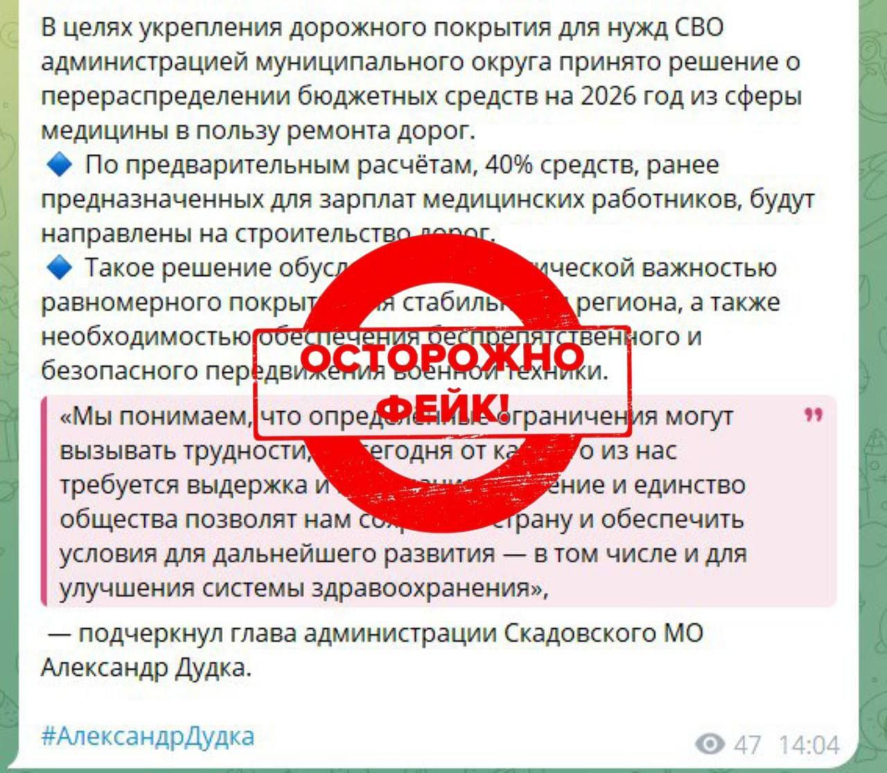 На деле публикация — подделка. Для распространения фейка был создан фальшивый аккаунт, имитирующий официальный Telegram-канал главы округа Александра Дудки.