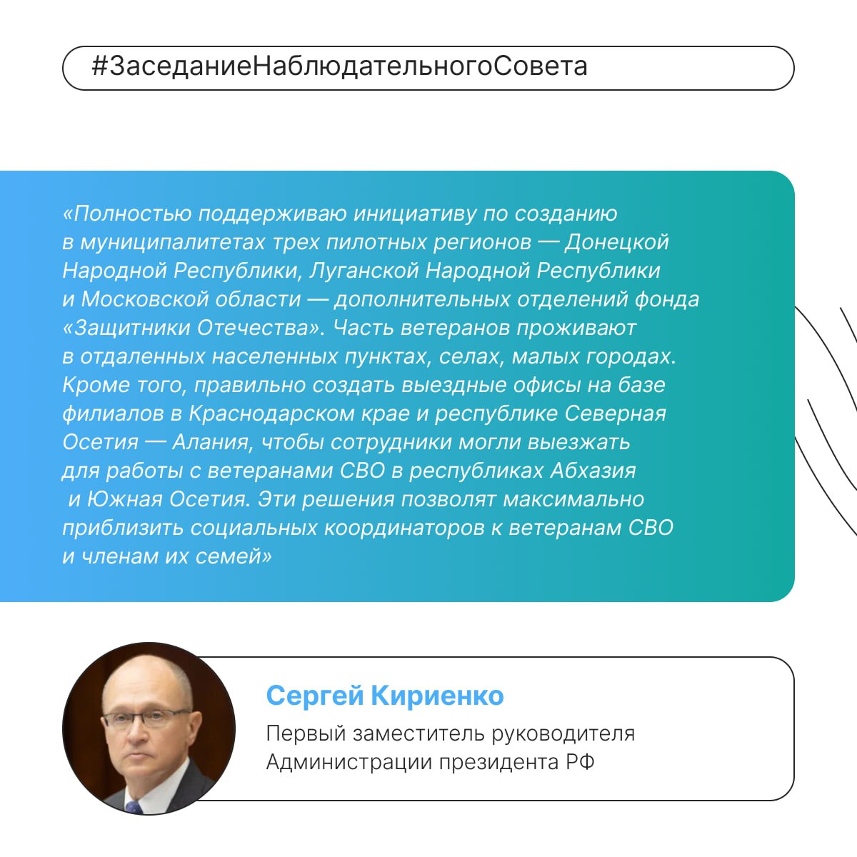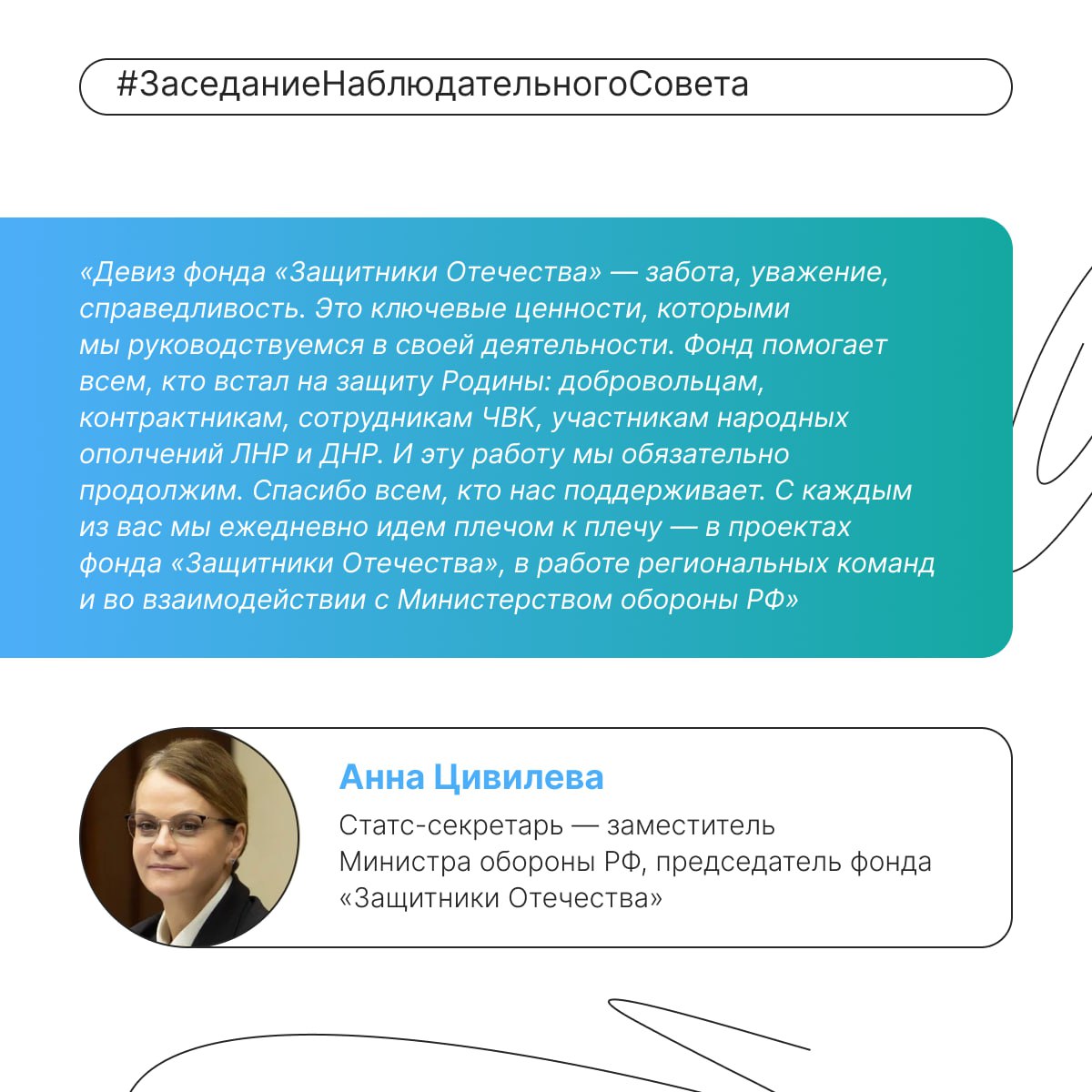 Государственный фонд «Защитники Отечества» продолжает системную работу по поддержке участников СВО и их семей. На очередном заседании Наблюдательного совета под председательством Первого заместителя Руководителя Администрации Президента РФ Сергея Кириенко и статс-секретаря — заместителя Министра обороны РФ, председателя фонда «Защитники Отечества» Анны Цивилевой были подведены промежуточные итоги и утверждены новые важные инициативы.