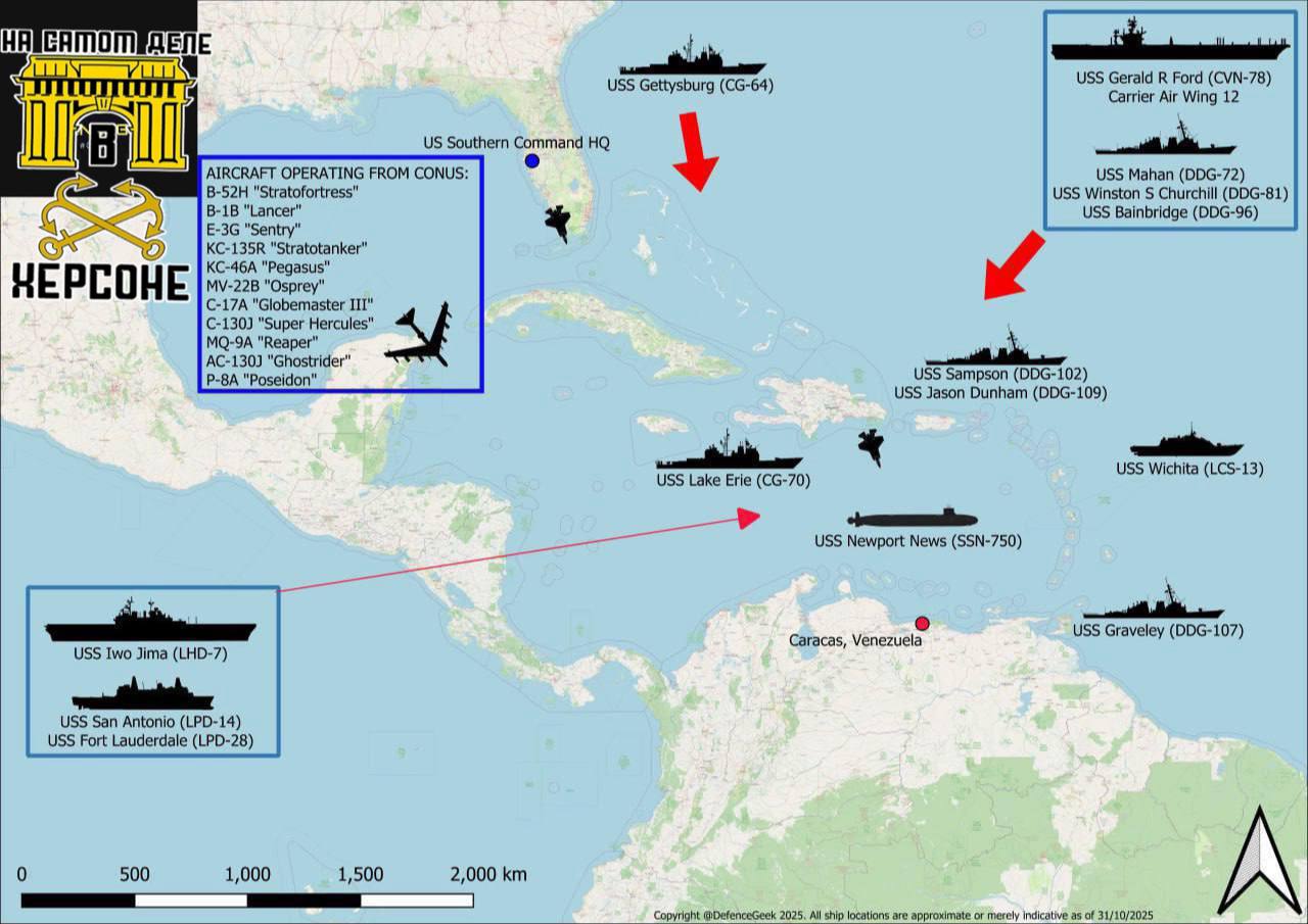 С конца лета США стянули в Карибское море крупную военную группировку, а сейчас, по данным СМИ, к стране дополнительно движется около 16 тысяч солдат, атомная подлодка и восемь военных кораблей, включая крупнейший авианосец USS Gerald R. Ford.