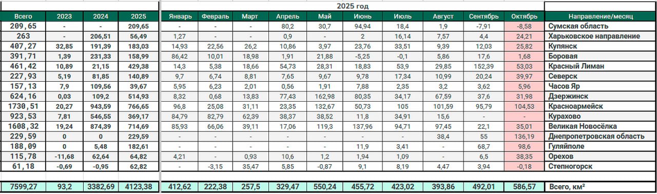 Сводная таблица территориальных изменений на карте Сливочный каприз связанных с ведением боевых действий в зоне СВО за октябрь 2025.