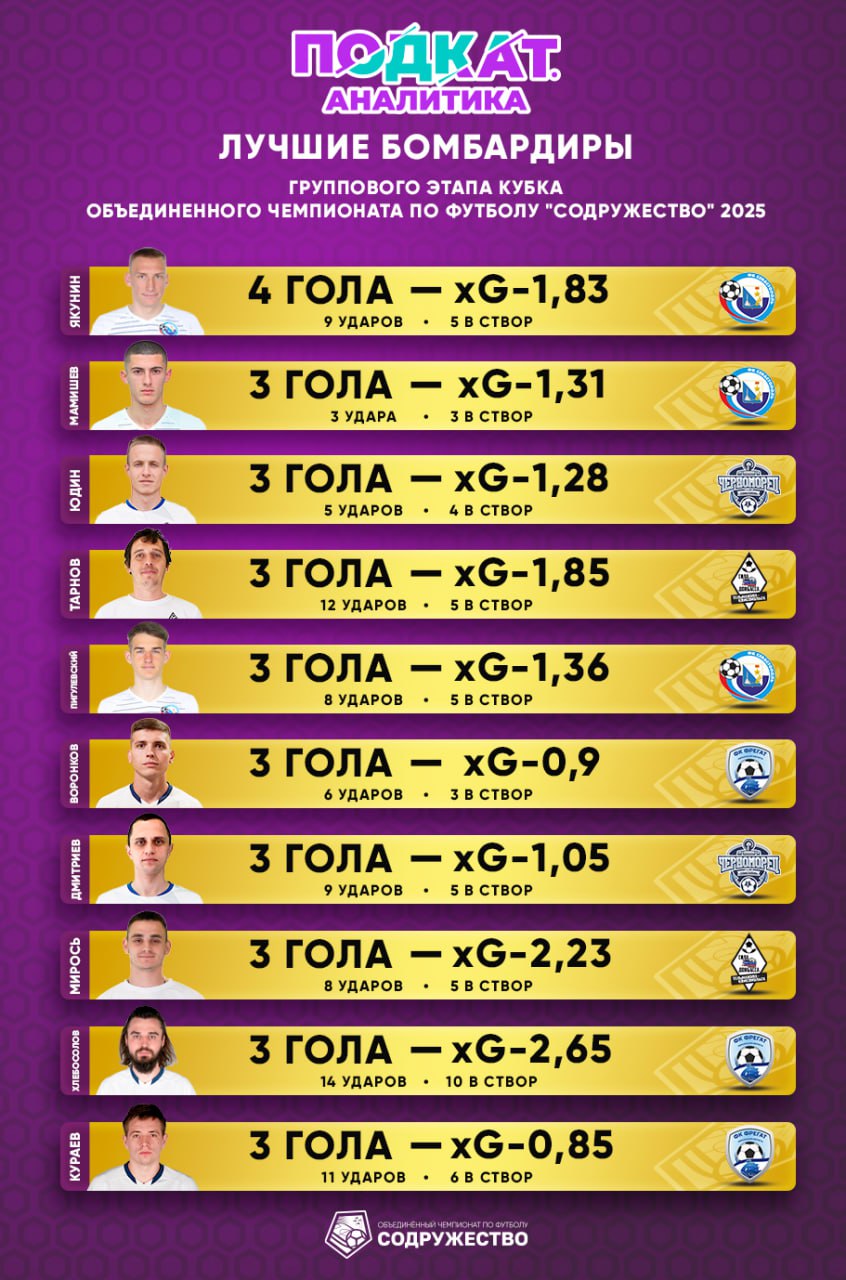 32345 Мы решили проанализировать список лучших бомбардиров Кубка «Содружество»-2025 после группового этапа.