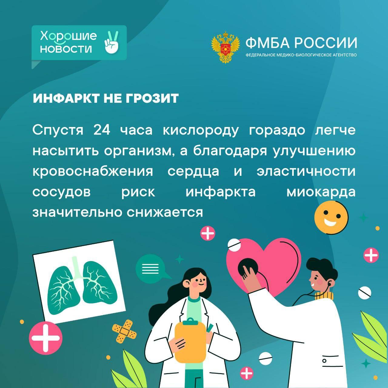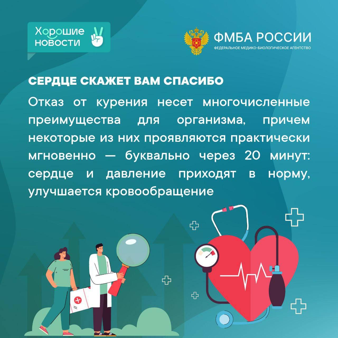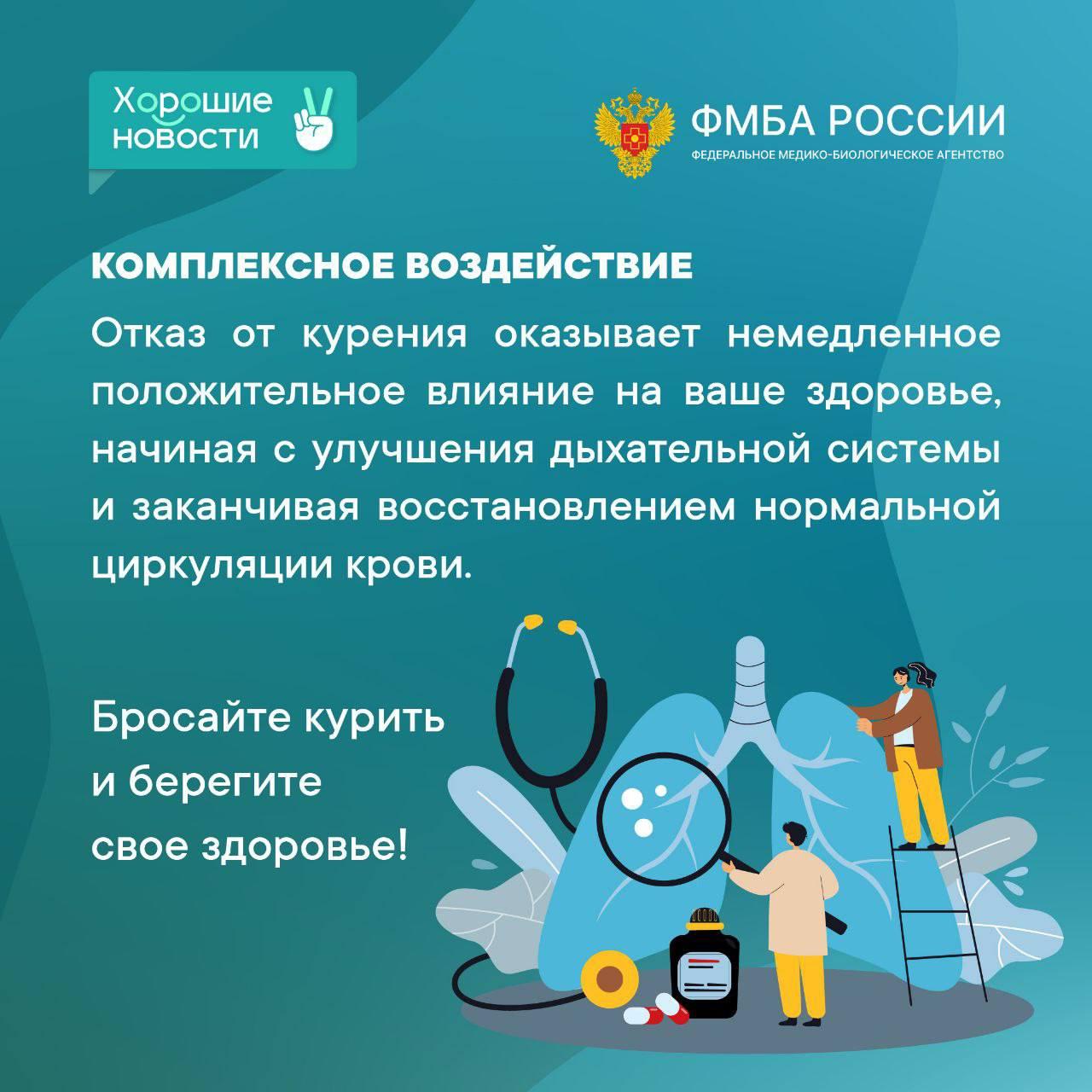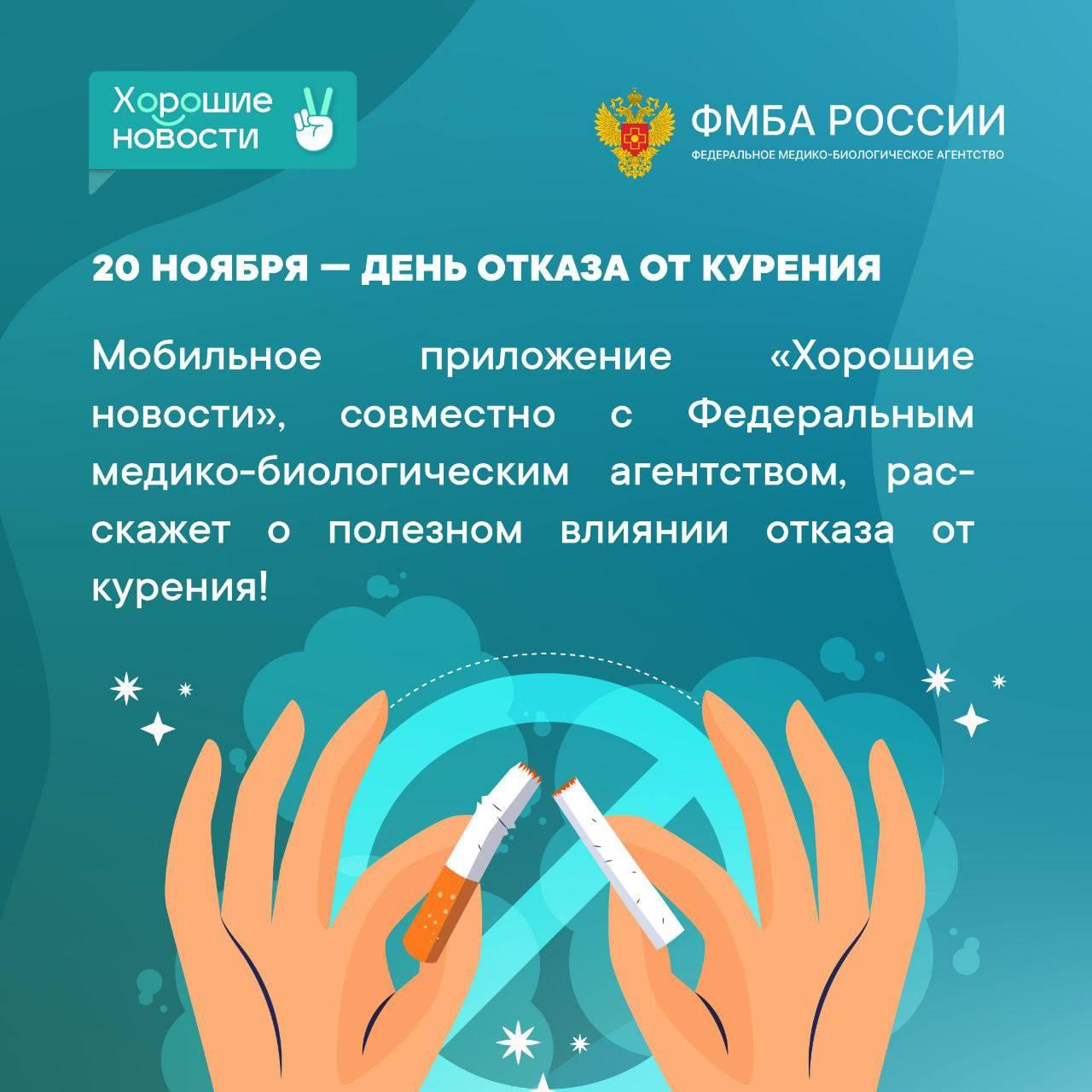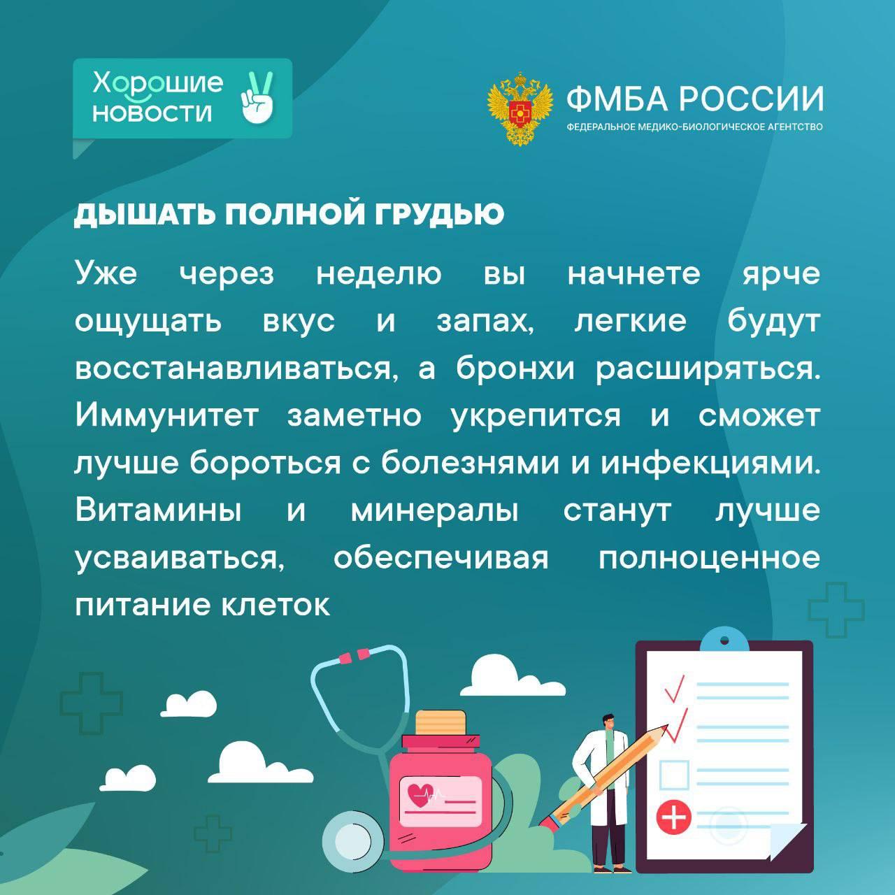 ФМБА России совместно с мобильным приложением «Хорошие новости» рассказывают о пользе отказа от курения.
