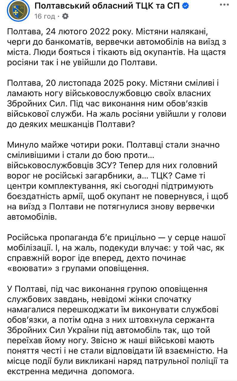"Неизвестные женщины сначала пытались препятствовать им выполнять служебные обязанности, а затем одна из них толкнула сержанта ВСУ под автомобиль так, что тот переехал ему ногу", - заявляет ТЦК.
