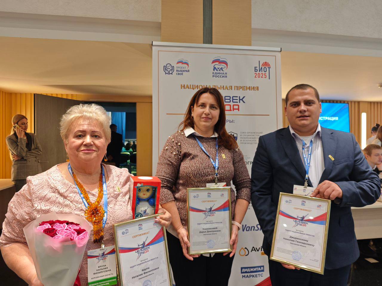 В церемонии награждения в Москве приняли участие трое наших земляков, победивших в региональном этапе премии: педагог с 46-летним опытом работы, директор Сивашской школы №2 Наталия Крупа, начальник абонентского отдела «Экологического оператора Херсонской области» Николай Джуринский (номинация «Молодой специалист») и сотрудник Черноморского биосферного заповедника Дарья Королесова, получившая признание в категории «Семейная трудовая династия» - общий стаж работы в отрасли у членов её семьи – больше 100 лет.