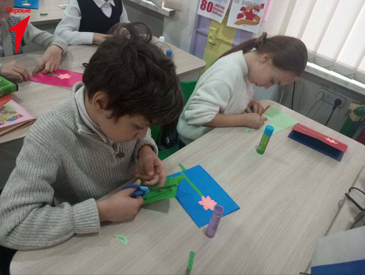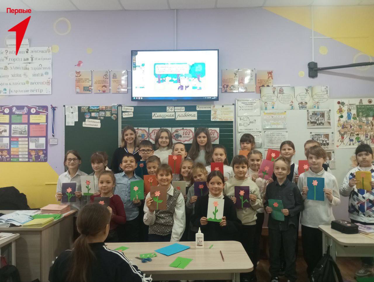 Под наставничеством старшеклассников ученики начальной школы вырезали разноцветные цветы и делали открытки для своих мам.
