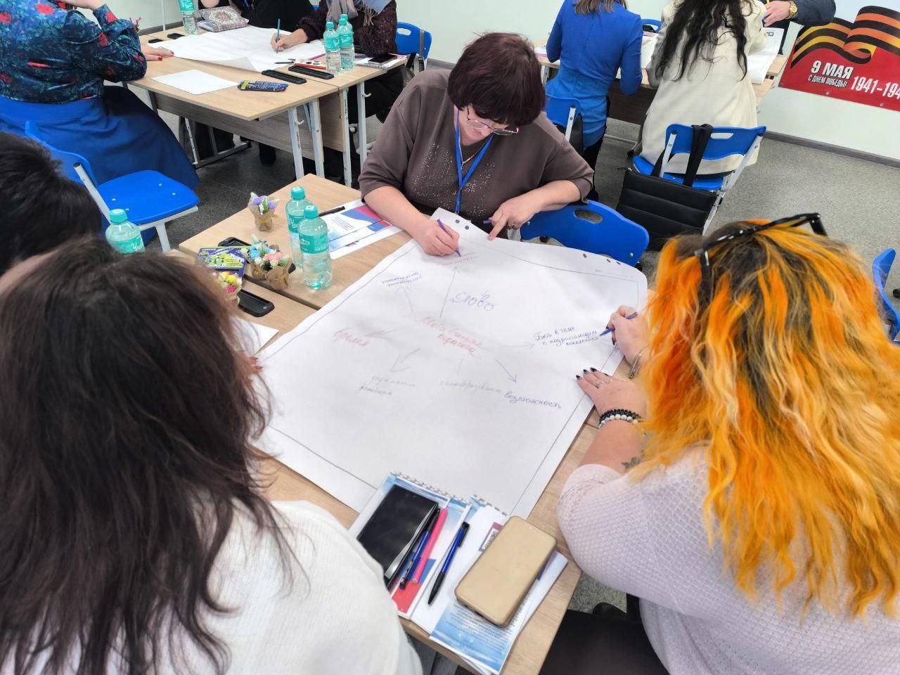 После уроков гости перешли к коллективному творчеству! Под руководством заместителя директора Лидии Кекутия и директора школы Людмилы Пашковой прошёл практикум с элементами деловой игры «Мировое кафе».