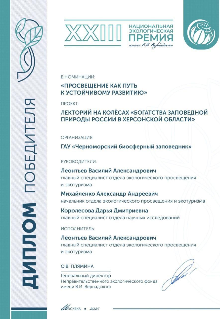 Специалисты Черноморского биосферного заповедника стали лауреатами XXIII Национальной экологической премии имени В.И. Вернадского, победив в номинации «Просвещение как путь к устойчивому развитию».