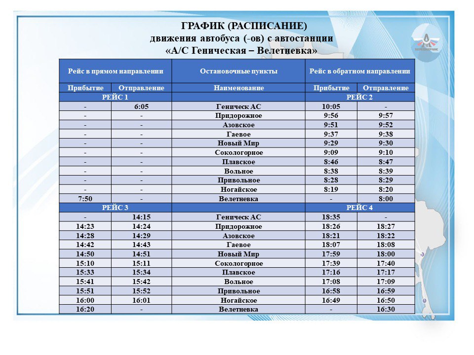 Маршрут следования:А/С Геническая Придорожное Азовское Гаевое Новый Мир Сокологорное Плавское Вольное Привольное Ногайское Велетневка