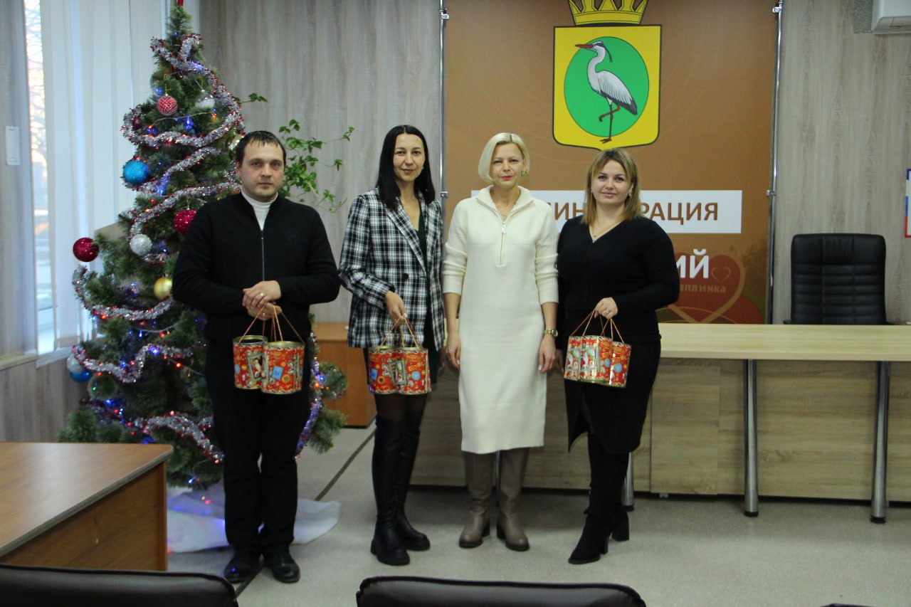 Глава Чаплинского округа и Секретарь местного отделения партии «Единая Россия» Лили Пуляева поздравила с наступающим Новым годом многодетных родителей — сотрудников администрации Викторию Мартюк, Владимира Володина и сотрудника Совета депутатов Алину Кацидан.