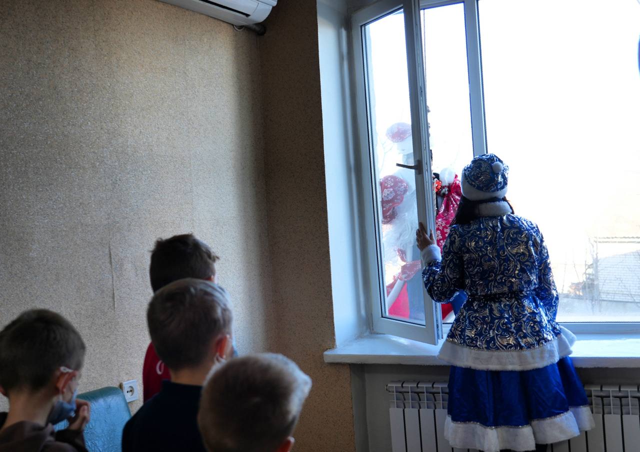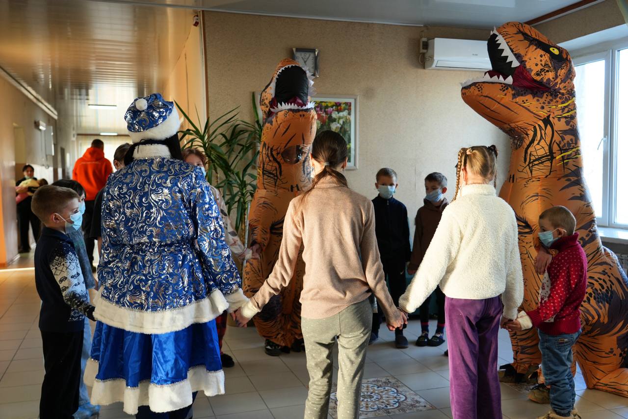К юным пациентам на праздник пришли гости — Снегурочка вместе со своими друзьями-динозаврами. Они развлекали детей в ожидании главного виновника торжества — Деда Мороза. Волшебник не заставил себя долго ждать и спустился с крыши с мешком подарков наперевес, чтобы поприветствовать ребят.