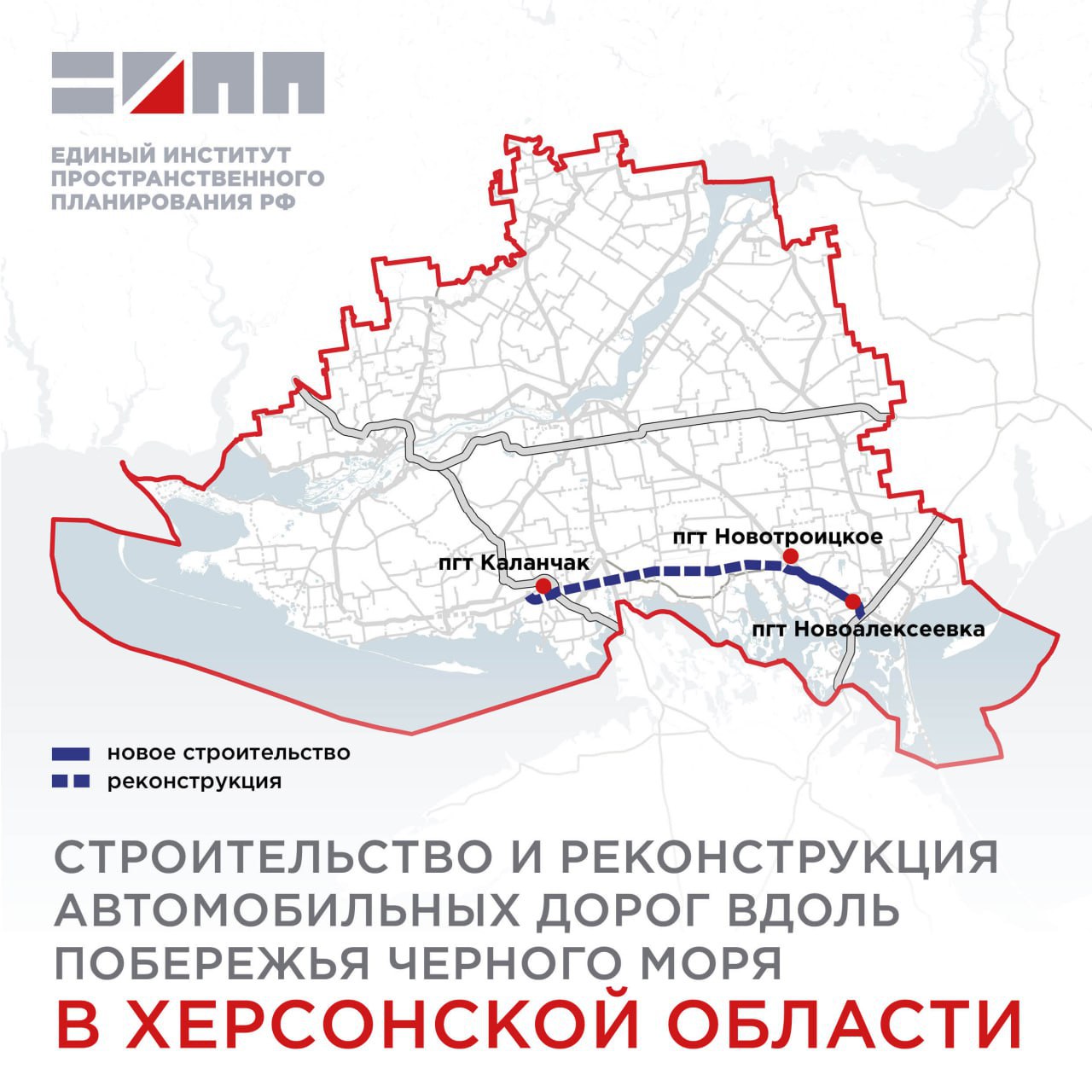 Единый институт пространственного планирования России предложил провести реконструкцию участка трассы Р-280 "Новороссия" до Скадовска и строительство новой дороги между поселком Новотроицкое и Каланчаком протяженностью почти 65 км.