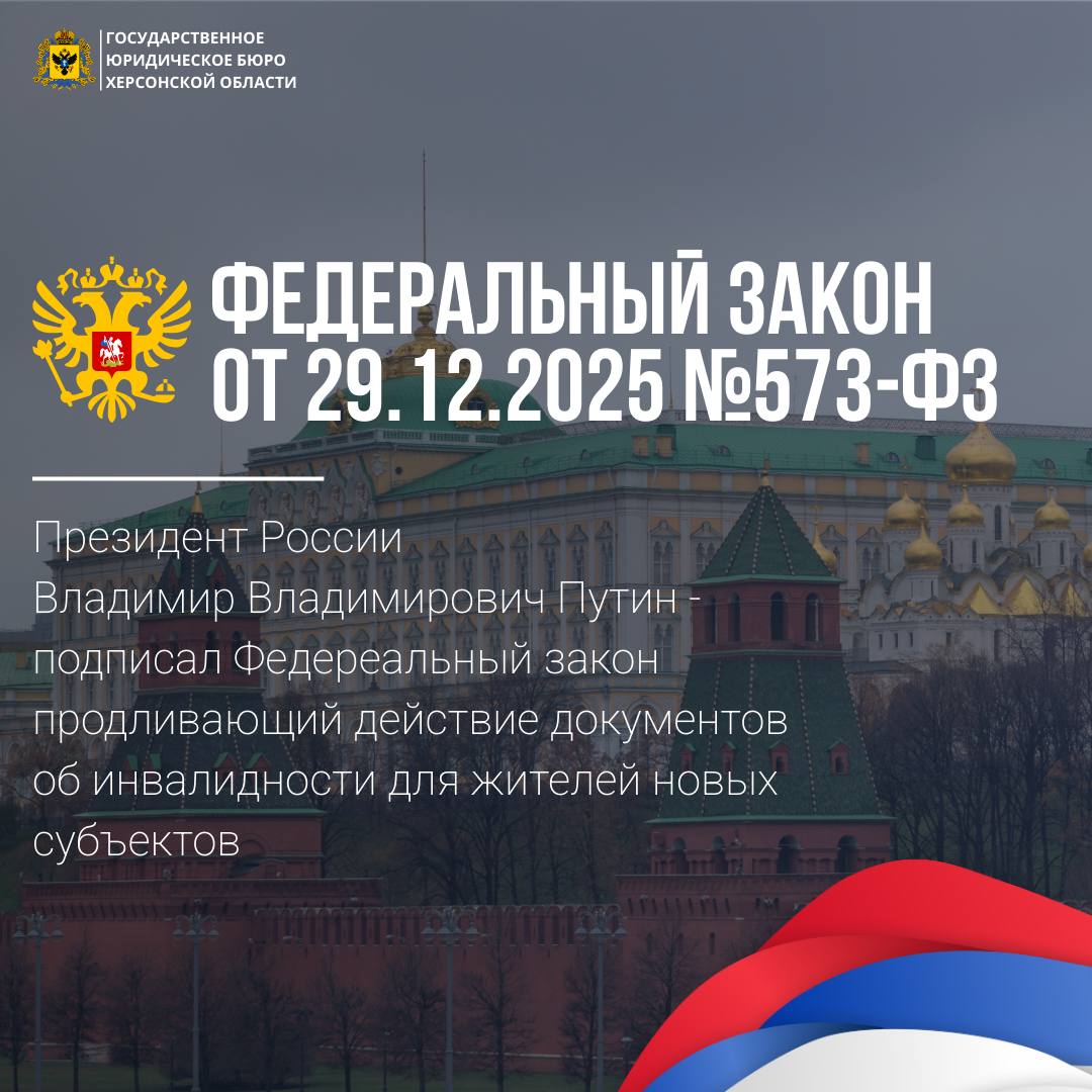 Президентом России подписан Федеральный закон (ФЗ от 29.12.2025 №573-ФЗ), который продлевает действие документов об инвалидности и утрате трудоспособности, выданных ранее на территориях ДНР, ЛНР, Запорожской и Херсонской областей, а также на территории Украины