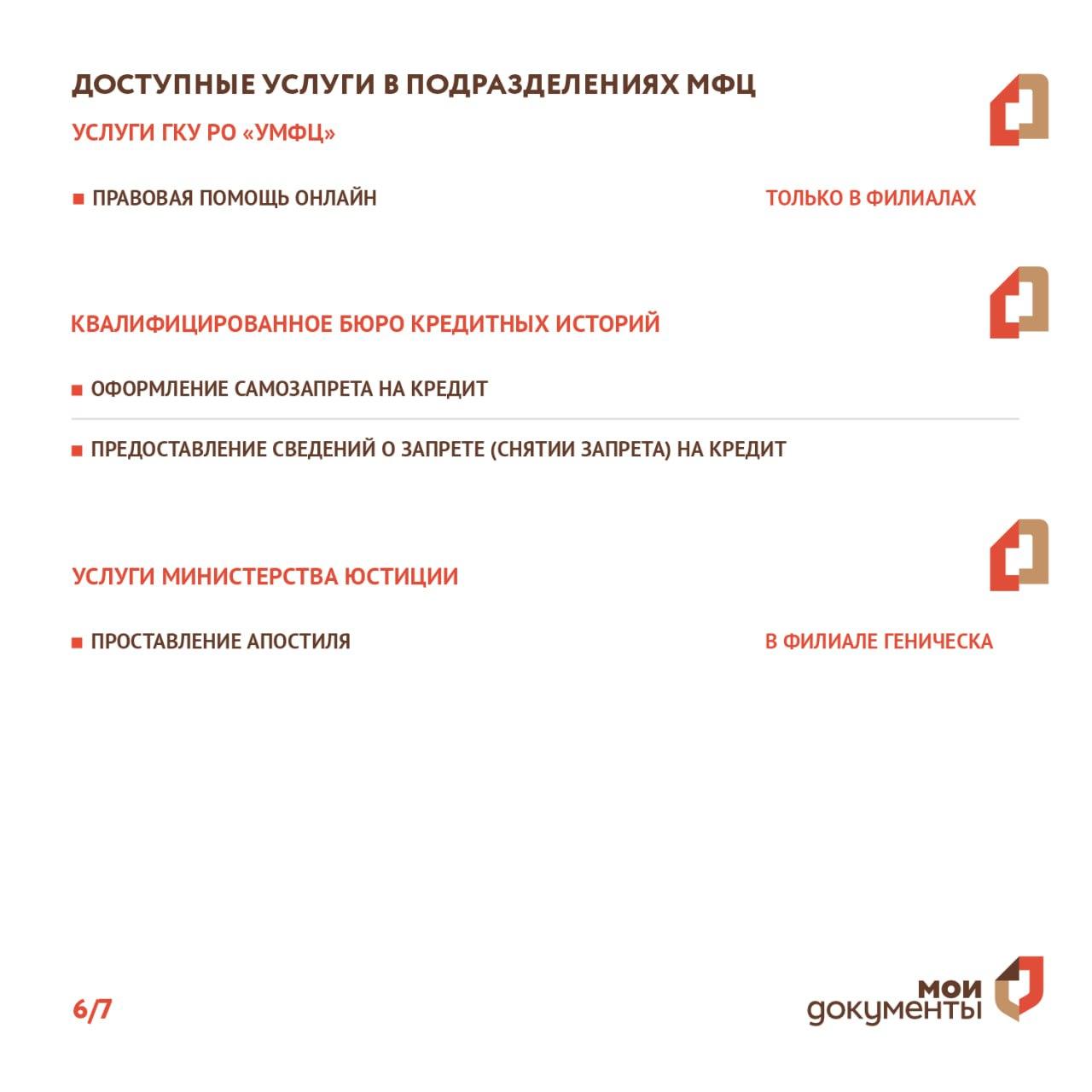 В отделениях МФЦ Херсонской области доступно порядка 70 государственных и муниципальных услуг. Разместили полный список в информационных карточках.