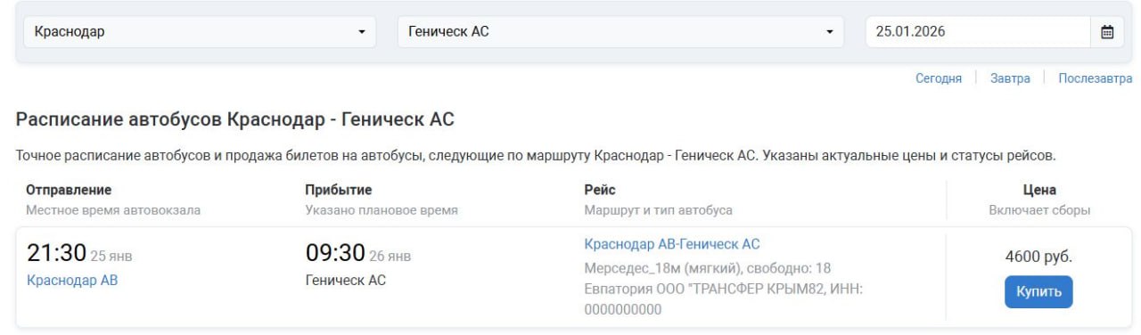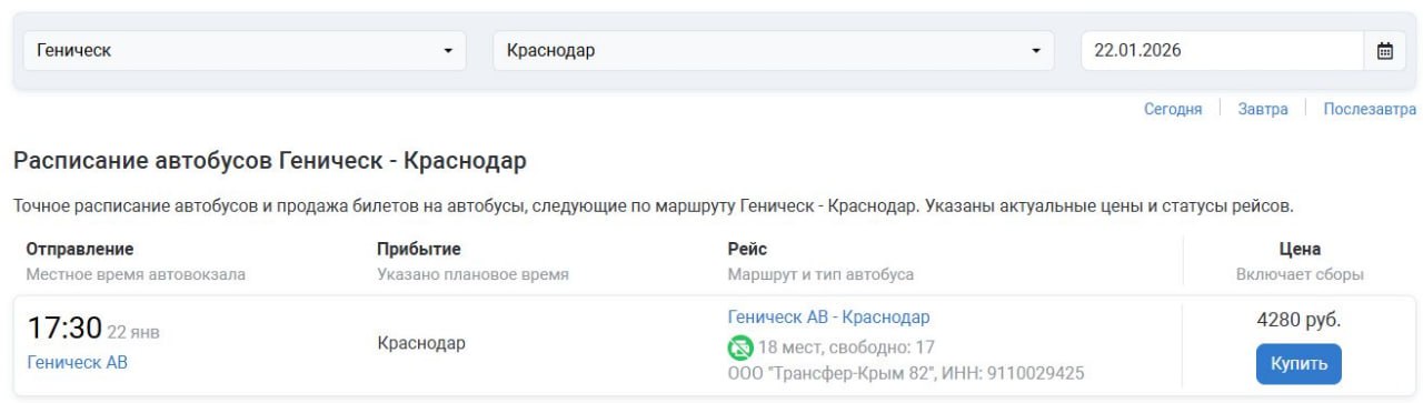 По нечетным — автобус выезжает из Краснодара в Геническ (в пути с 21:30 вечера до 09:30 утра).