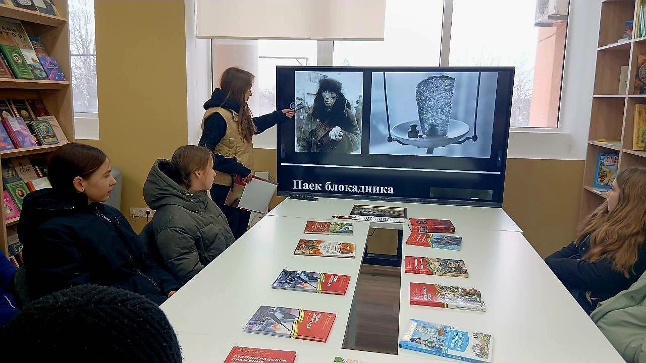Библиотекарь Кира подготовила насыщенную программу, включавшую в себя несколько ключевых элементов. В начале мероприятия вниманию ребят была представлена книжная выставка "Ты выстоял, город-герой Ленинград".