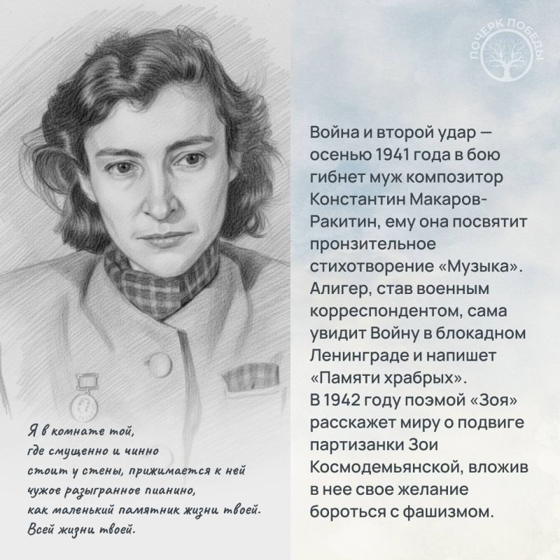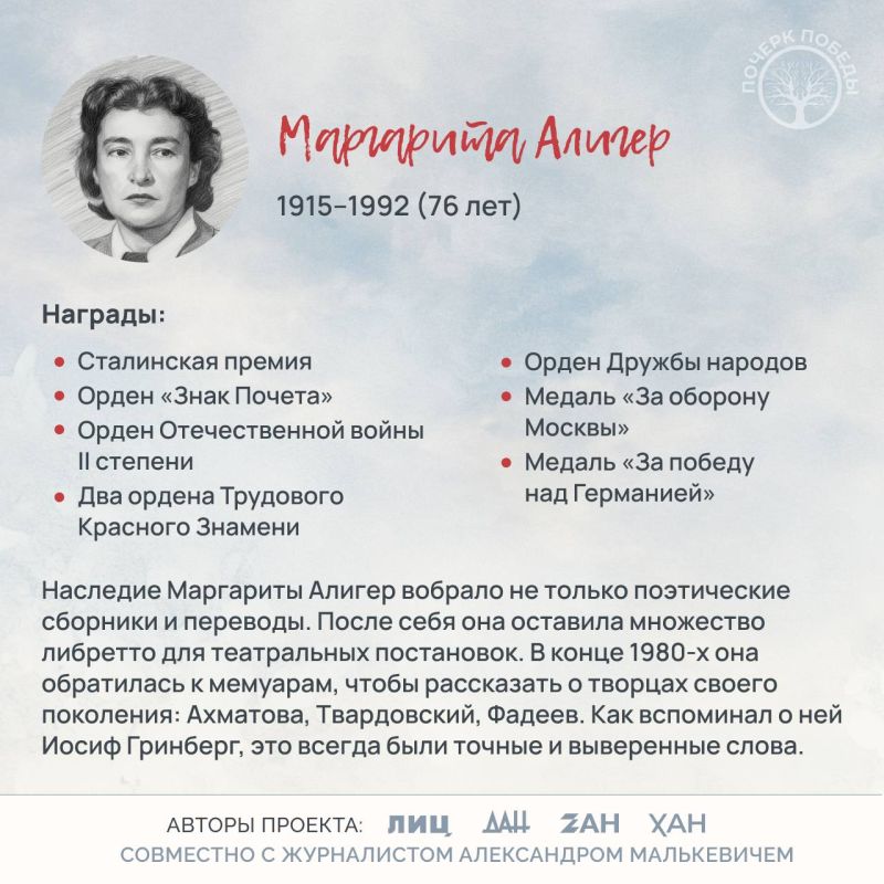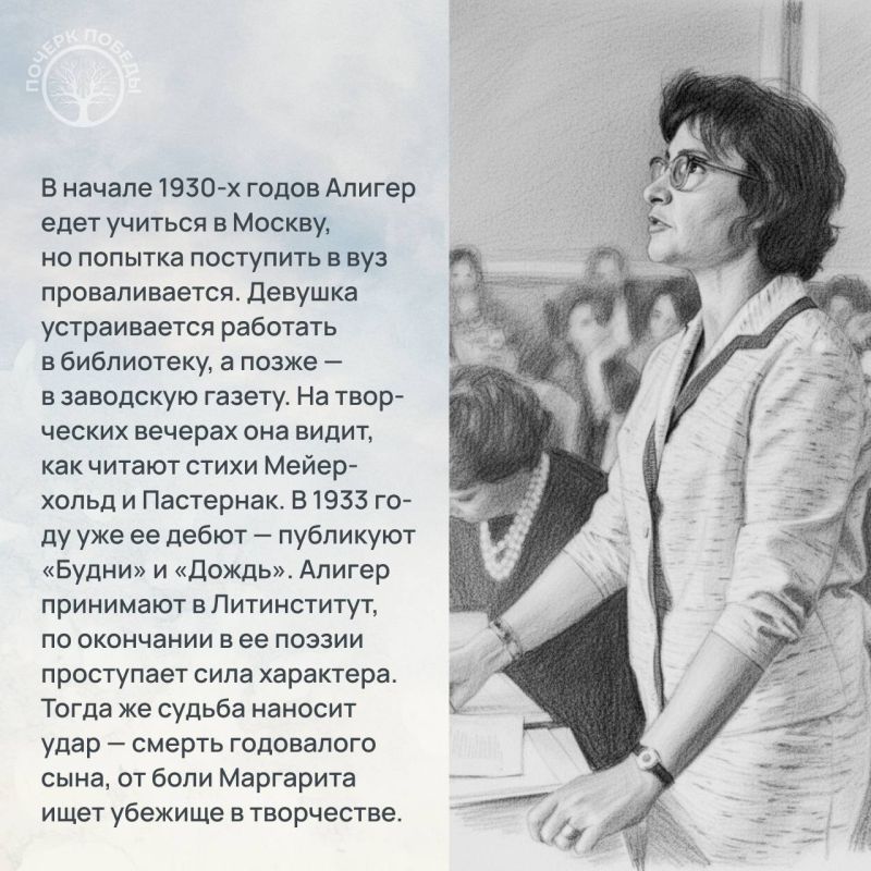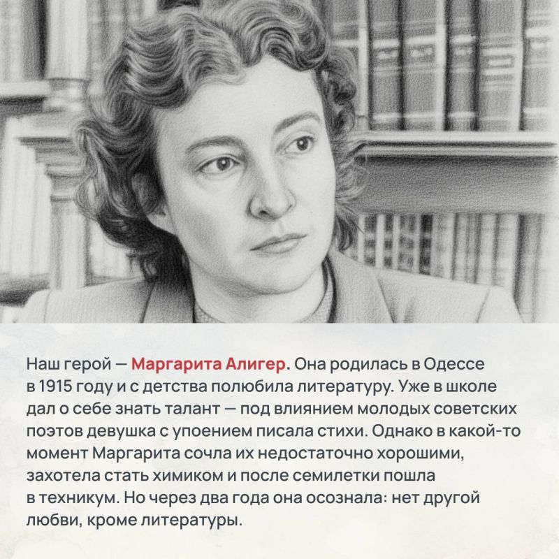 В 32-й главе мы расскажем про Маргариту Алигер. Она родилась в Одессе и с детства писала стихи. После переезда в Москву у нее только росло это влечение, в 1930-х она учится в Литинституте, тогда же ее поэтический дебют — два стихотворения печатают в «Огоньке».