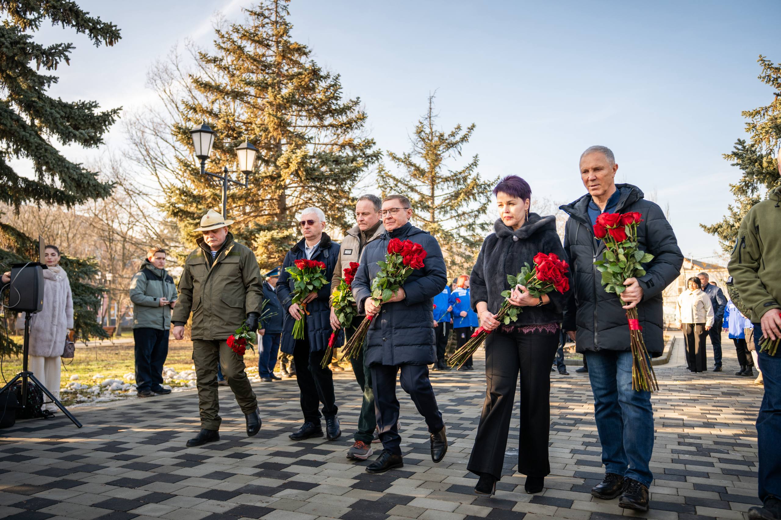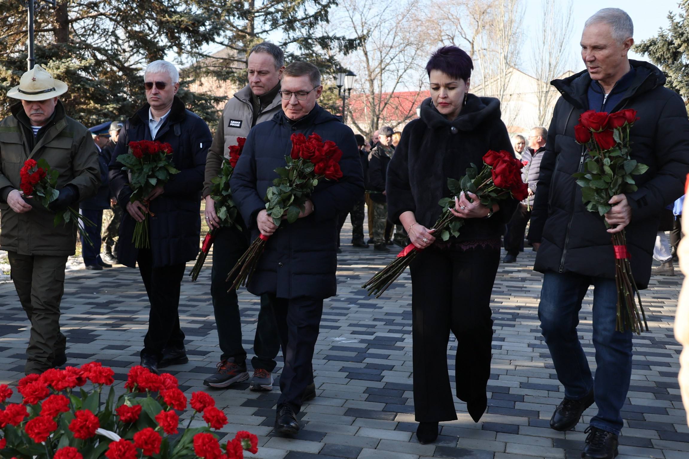 Вместе с ветеранами Афганской войны, бойцами СВО, Херсонским областным отделением «Боевого Братства» и активистами Молодой Гвардии возложили цветы к монументу «Скорбящая мать», расположенному в сквере «Воинской славы» в Геническе.