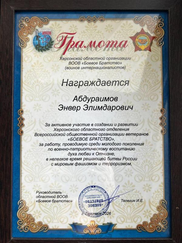 Для меня деятельность «Боевого братства» особенно близка. Организацию возглавляет мой товарищ и коллега, депутат Херсонской областной Думы Игорь Евгеньевич Телегин — ветеран афганской войны, человек твёрдой позиции и личной ответственности, своим примером подтверждающий верность боевому братству и служению стране.