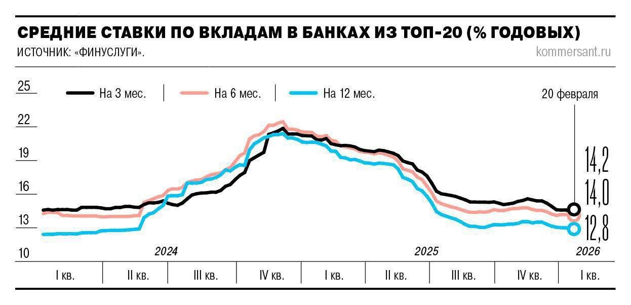 Средняя ставка на вклад на срок 3 месяца опустилась до 14,2% годовых, на 6 месяцев – до 13,97%, на год — 12,8%.