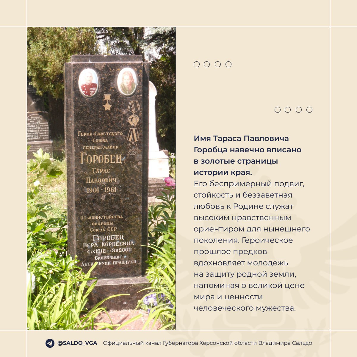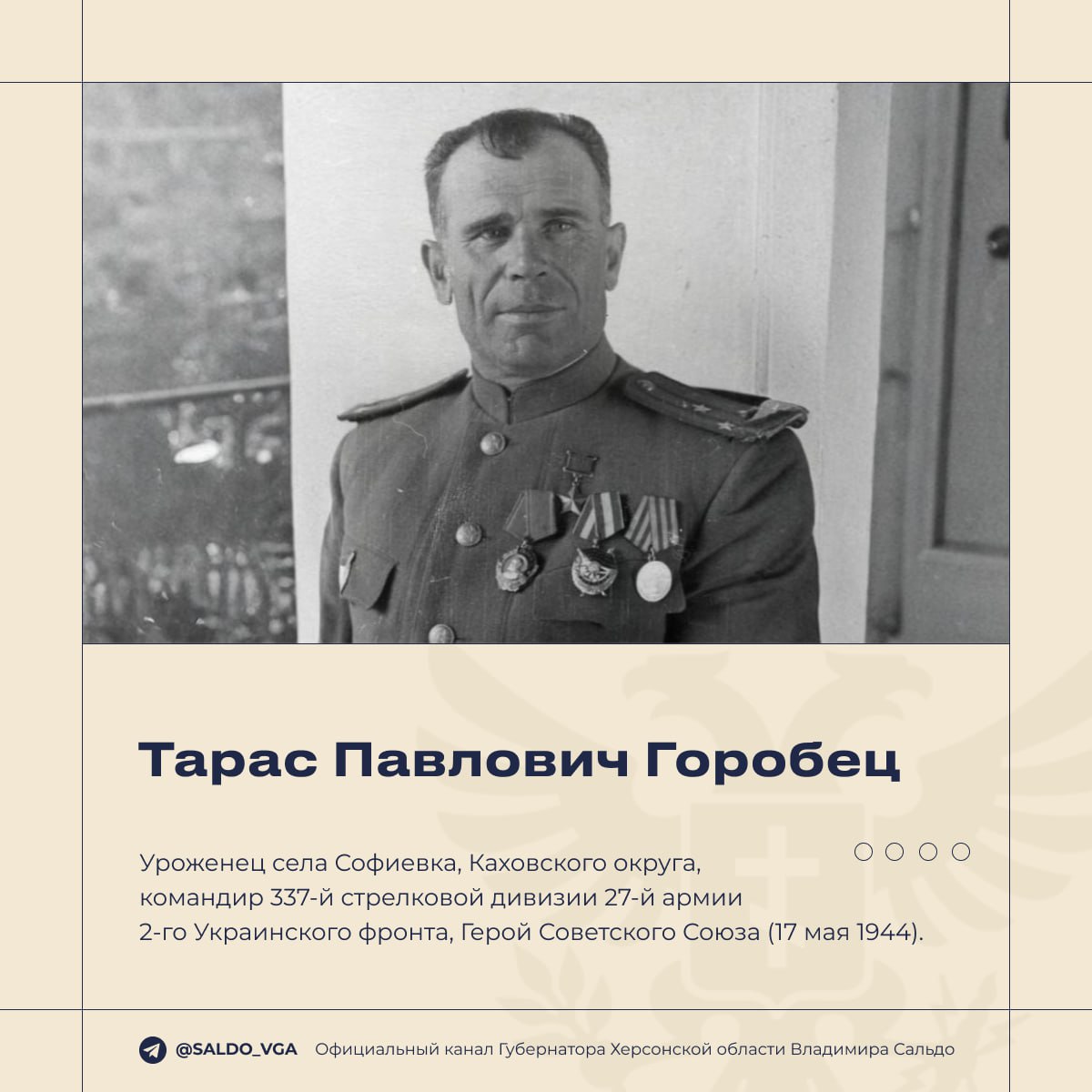 Сегодня исполняется 125 лет со дня рождения нашего выдающегося земляка Тараса Павловича Горобца — Героя Советского Союза, генерал-майора, уроженца села Софиевка Каховского района.