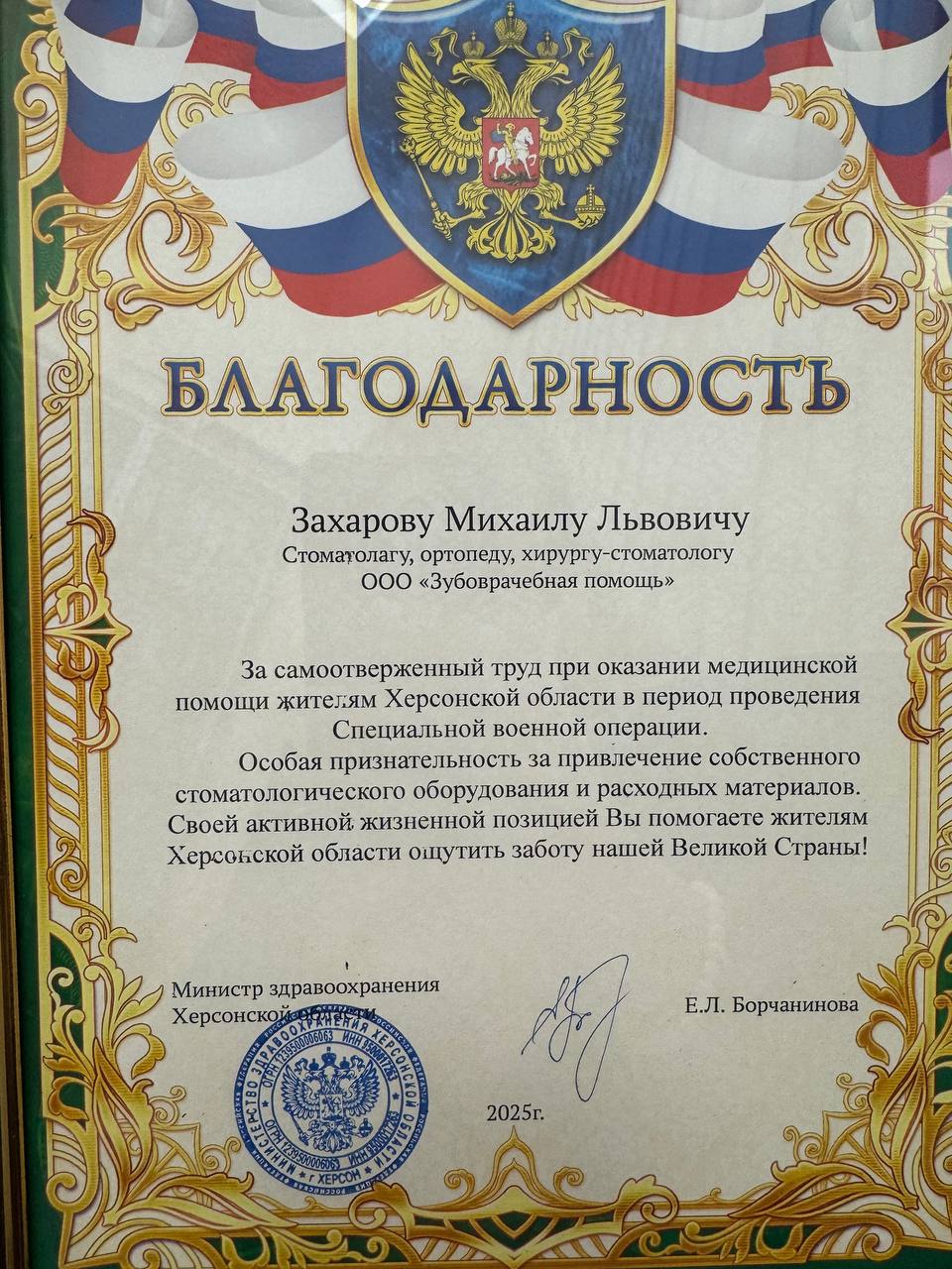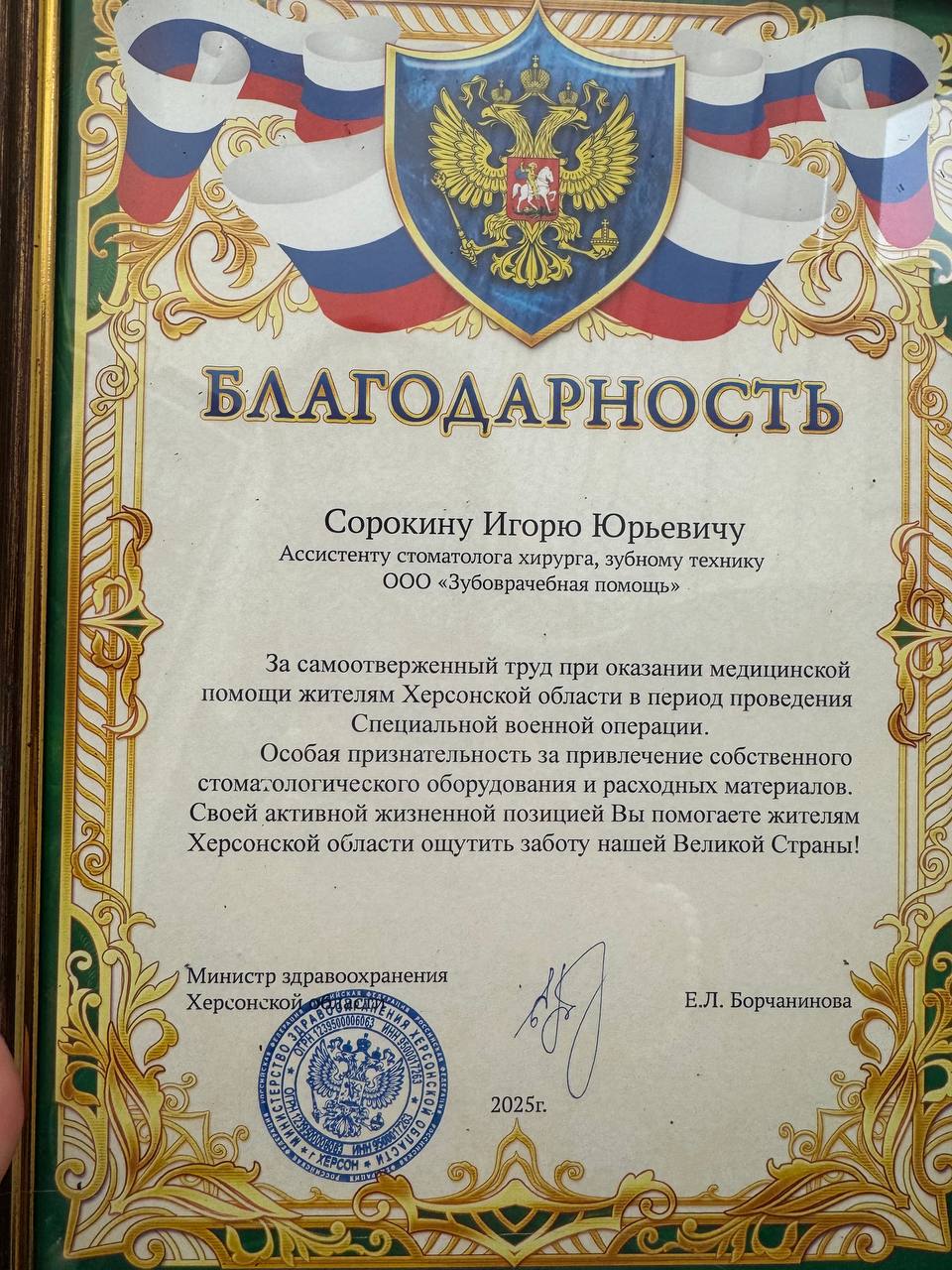 С утра выполнил приятную миссию – вручил благодарности от министра здравоохранения Херсонской области Елены Борчаниновой двум врачам - стоматологам из Москвы.