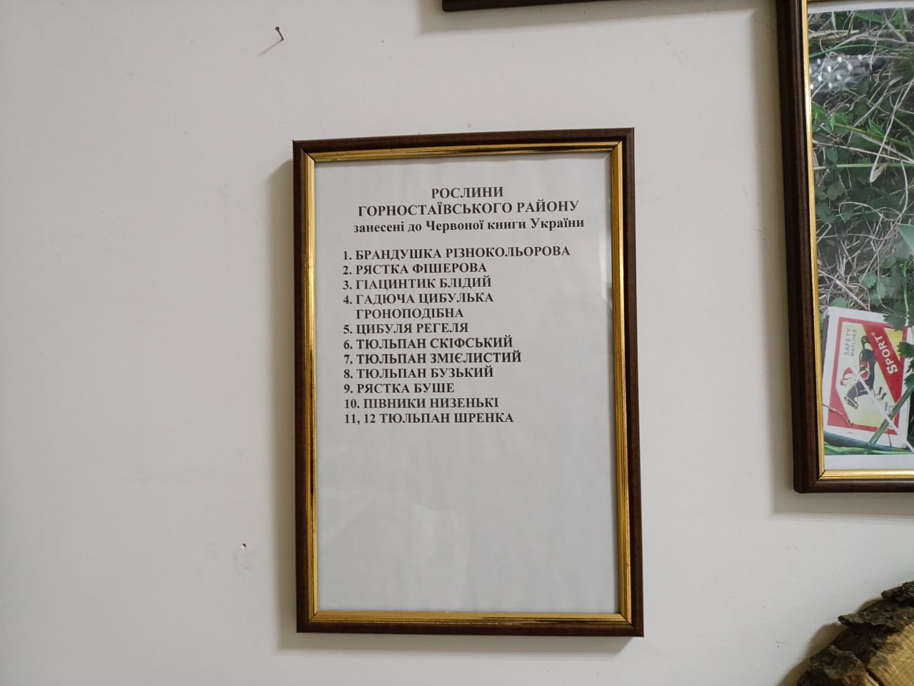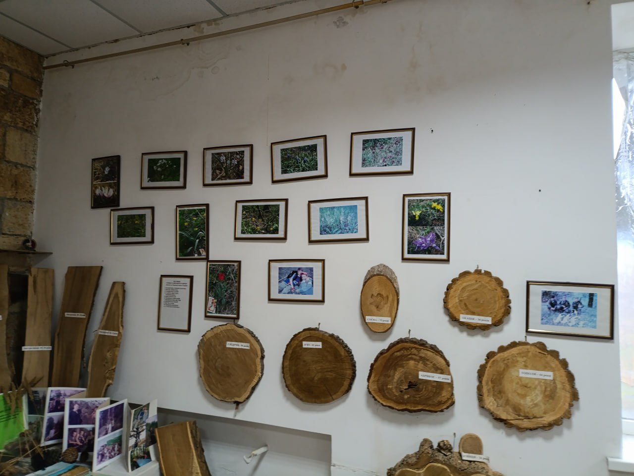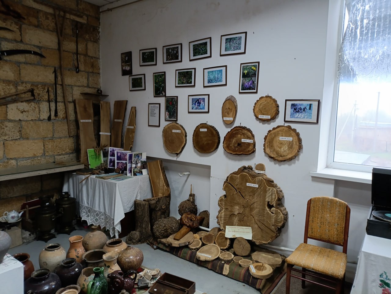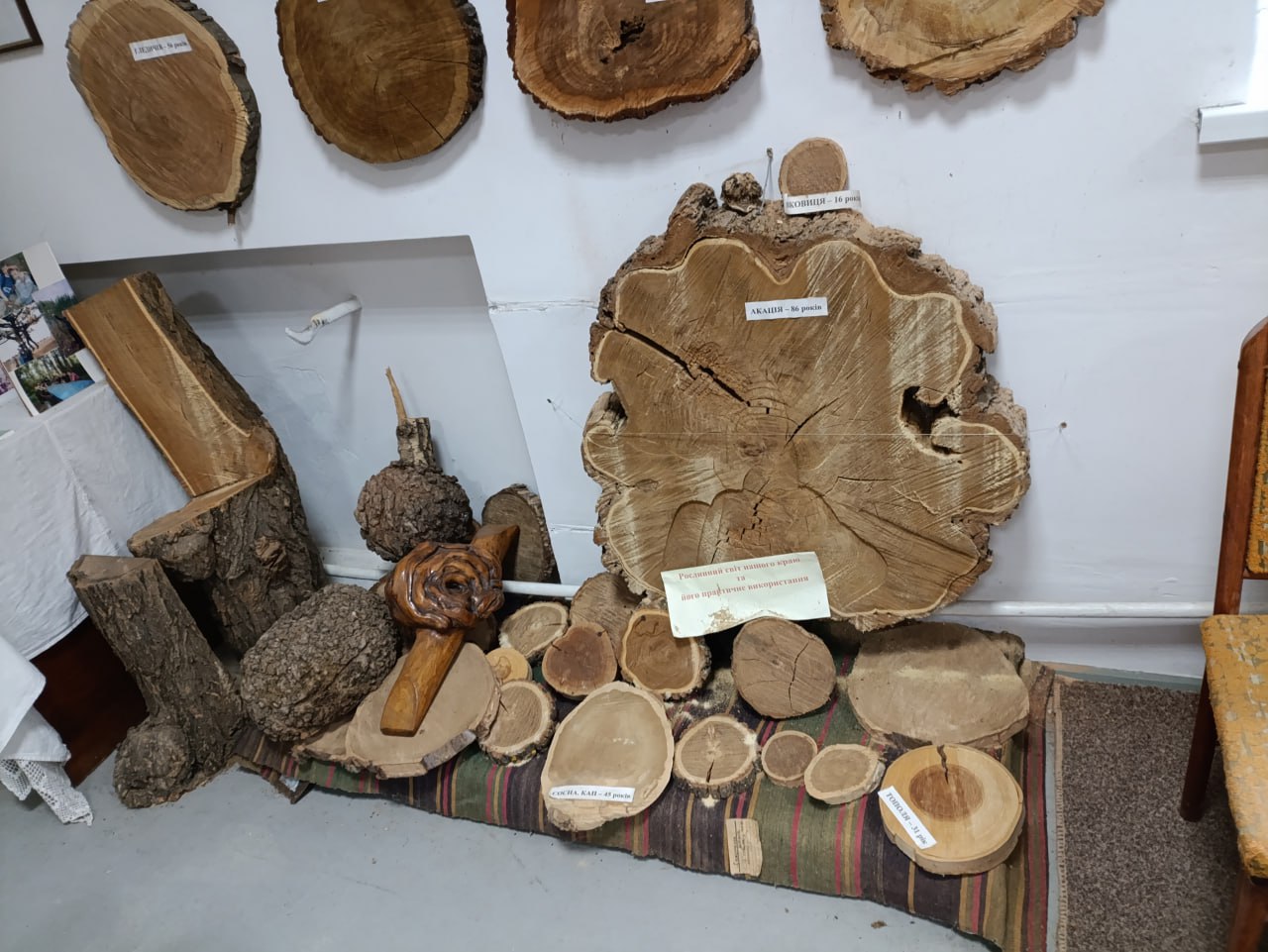 В экспозиции представлены срезы деревьев, произрастающих на территории района, а также фотографии исчезающих растений, которые внесены в Красную книгу.