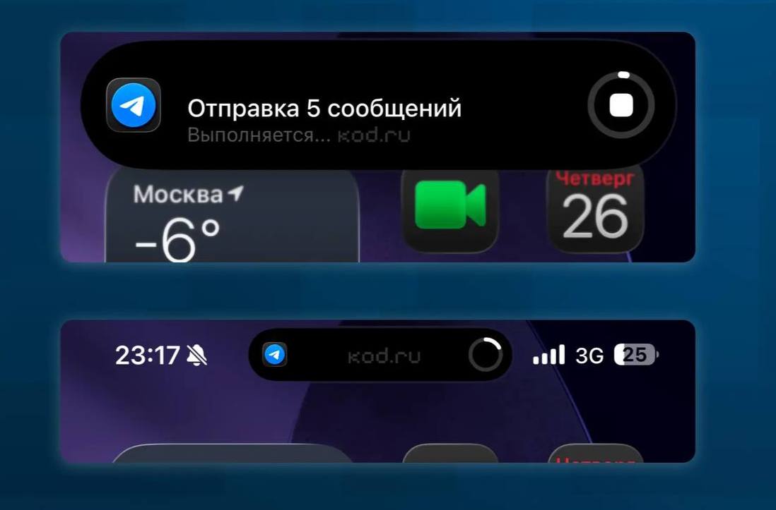 Теперь не надо сидеть с открытым чатом, пока отправляешь файлы. Можно свернуть приложение и следить за статусом в Dynamic Island.