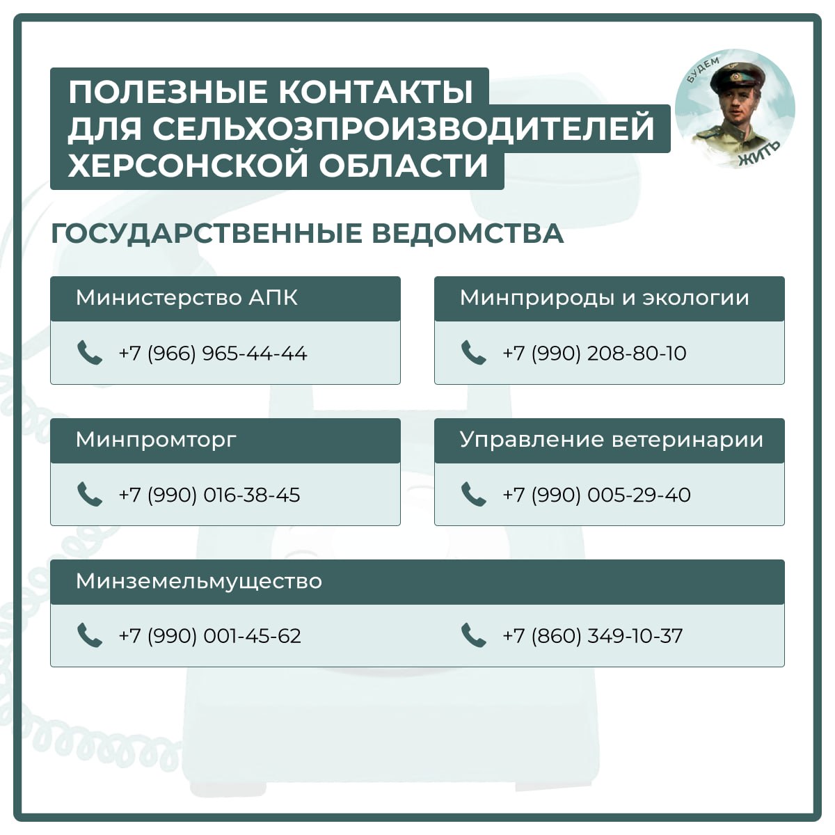 В карточках смотрите актуальные контакты профильных министерств, управлений и служб, куда могут обратиться сельхозпроизводители