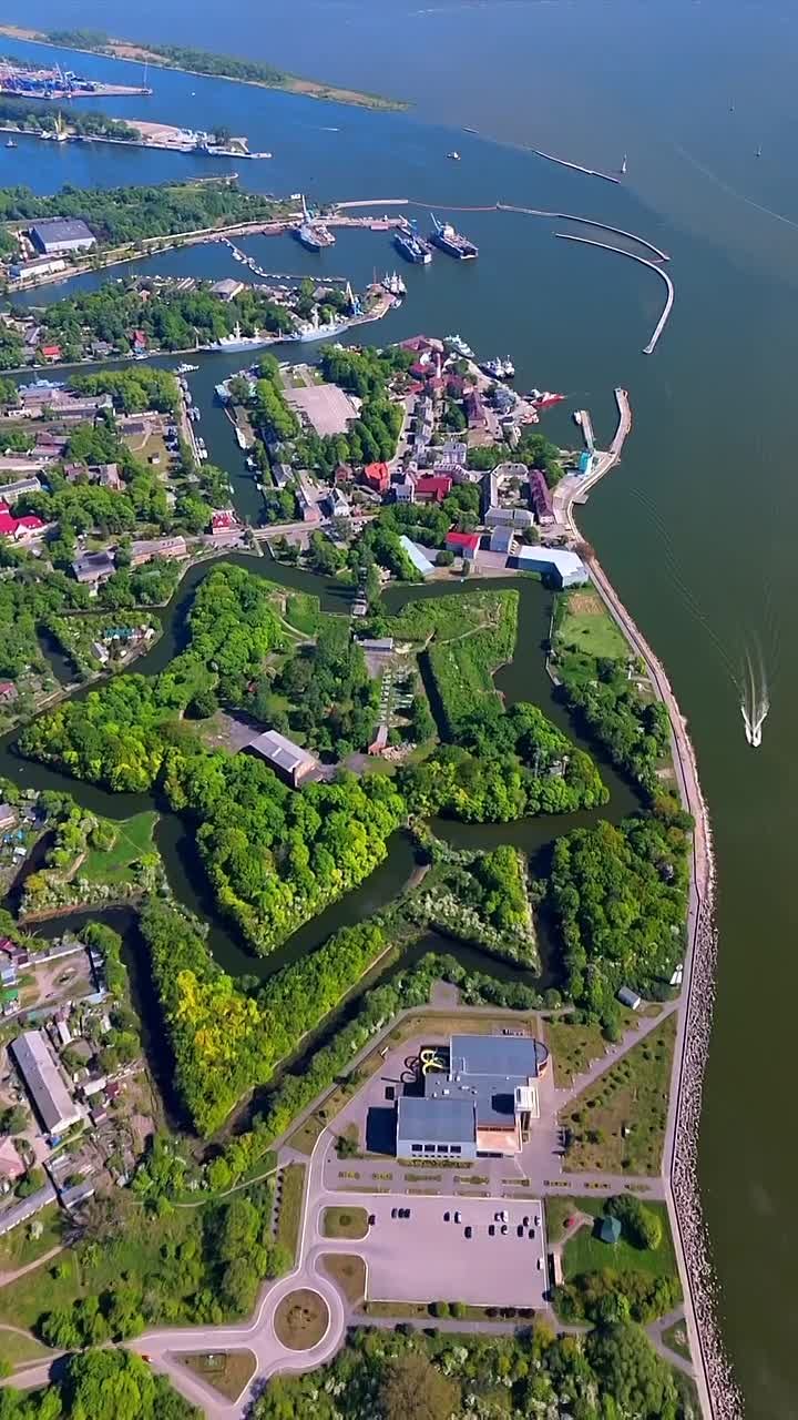 Самый западный город России Балтийск примечателен пятиконечной крепостью Пиллау, которую отчётливо видно с высоты птичьего полёта.