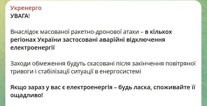 В столице Украины началось аварийное отключение электричества. Причина — массированная ракетно-дроновая атака. Об этом сообщает оператор энергосистемы «Укрэнерго».