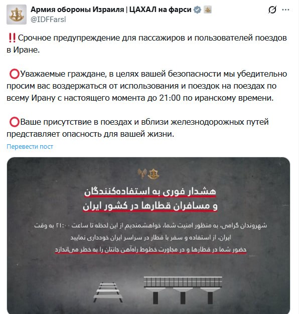 Израильские военные предупредили, что нахождение в поездах или рядом с путями «опасно для жизни». Ограничение действует до 21:00 по иранскому времени (20:00 мск).