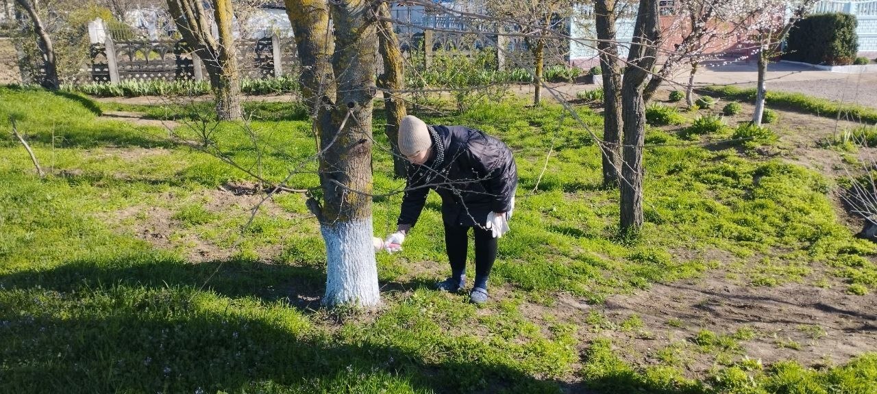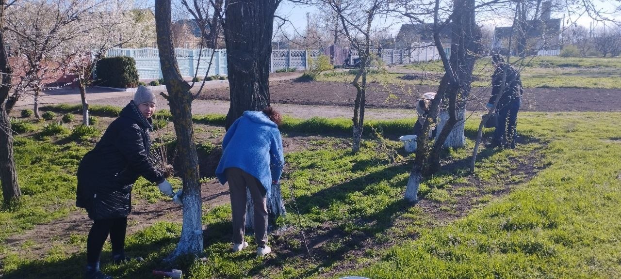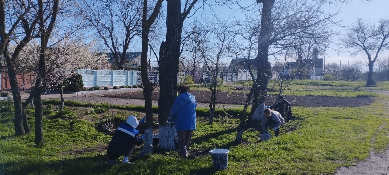 Работники Любимовского участка "Коммунального сервиса Каховки" и сотрудники территориального отдела провели побелку деревьев на центральной улице Мелитопольской.