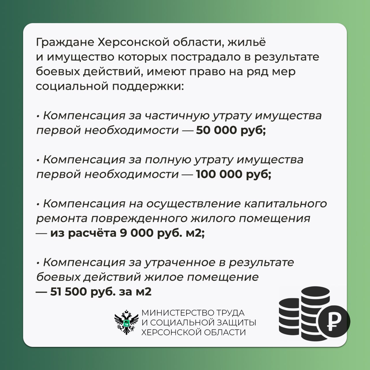 Для подачи документов обращайтесь в администрации муниципальных округов (https://t.me/mintrud_kherson/10184) по месту проживания.